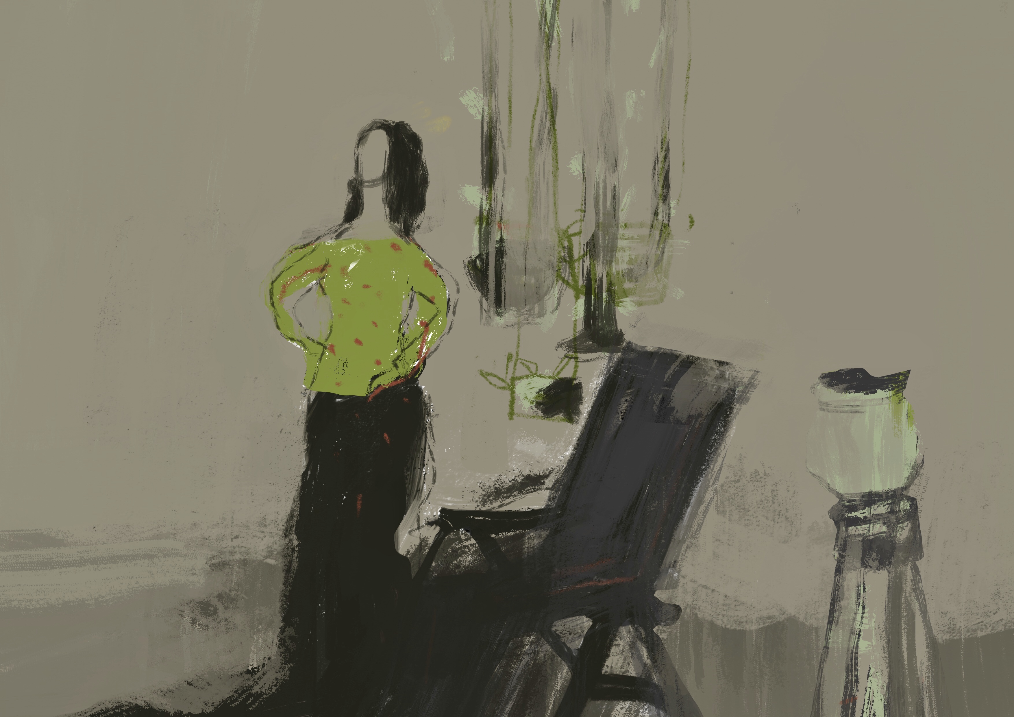 TTCT - Trên đời này có nhiều thứ mình đã thấy hằng ngày, đã nhìn ngắm, vuốt ve hàng giờ, đã biết - thậm chí cho rằng đã biết tường tận, chợt một ngày giật mình nhận ra mình không biết gì cả, hoặc không hề biết một cách rõ ràng về nó như mình vẫn nghĩ. Minh họa: Nguyễn Ngọc Thuần Cái ghế xếp khung inox, mặt ghế đan những sợi nhựa xanh đỏ, để ở ban công tầng một. Cái ghế xếp đã cũ lắm rồi. Thụy không nhớ nổi mình mua nó từ lúc nào và đã nằm lên nó lần nào chưa. Lâu quá rồi. Và vì Thụy, như một số người, đầu tắt mặt tối đến mức có lúc còn không nhớ mình là ai trong cái thời đại công nghệ chấm… chấm không; giữa “cuộc chiến sinh tử” để giành tiền, quyền và nhiều thứ khác; xem mạng ảo như cuộc sống thật…này.Nhưng giờ thì Thụy đang nằm trên cái ghế đó. Thụy đang rảnh.Ban công bề rộng khoảng một thước, thường ngày bụi bặm, hôm nay Thụy thấy nó sạch trơn, nền gạch màu ngọc thạch xanh mướt. Cái ghế xếp để trên ban công hướng về phía bức tường ngăn cách với nhà hàng xóm. Trên tường có một bức tranh đắp ximăng, sơn nước phong cảnh một vùng quê thanh bình. Bên trái là rặng tre với những thân cây vàng óng, lá xanh lòa xòa, sấp ngửa trong gió. Bầu trời trong trẻo trôi vài cụm mây trắng nhập nhòa trong ráng chiều vàng rợi. Cách rặng tre một lạch nước là doi đất ven sông. Nước sông lững lờ, những dợn sóng ánh bạc. Trên doi đất có một căn nhà lá. Chái bếp nằm cạnh mé sông, bên dưới mé sông um tùm mấy bụi ô rô, cóc kèn. Ngay sau gian nhà chính, một cây bàng gai lá to phủ bóng mát xuống mái nhà. Xa xa, mấy rặng bần xanh chạy mải miết ven sông. Xa nữa, lại thấp thoáng một mái nhà.Lặng nhìn bức tranh, Thụy như nghe được cả mùi thơm nồng của mái lá, mùi hương ngai ngái của đồng quê, mùi ngan ngát của gió sông và mùi thanh bình của cuộc sống.Bức tranh ở đó đã hơn 20 năm, tính từ ngày Thụy cất căn nhà này và nhờ một ông họa sĩ không tên tuổi đắp, vẽ cho mảng tường đỡ đơn điệu. Vậy mà đến tận bây giờ, Thụy mới thật sự ngắm nghía, cảm nhận bức tranh một cách kỹ lưỡng, đầy cảm xúc, thấy biết ơn ông họa sĩ đã để lại trên góc tường một bức tranh đơn sơ, tĩnh lặng mà tinh tế và giàu sức sống đến vậy. Ông họa sĩ hồi đó làm bức tranh tường xong, lặng lẽ nhận tiền thù lao, lặng lẽ rời đi giữa lúc chủ nhà còn bộn bề với hàng mớ thủ tục hoàn công, mãi sau này vẫn không đủ thời gian ngắm kỹ bức tranh. Không biết ông họa sĩ giờ đang ở phương trời nào, còn hay mất. Thụy chợt thấy sống mũi cay cay ngượng ngùng.Giờ thì Thụy ngắm bức tranh, ngắm tỉ mẩn từng đường nét. Thụy đang rảnh.Ngoài lan can là hai bồn bông giấy. Cũng không nhớ trồng đã bao năm. Có khi từ hồi mới cất nhà, còn háo hức nhà mới nên tậu hai cây bông giấy về. Giờ mỗi gốc đã to bằng cườm tay. Thụy nhìn hai cây bông giấy, lạ lẫm như mới thấy lần đầu. Hai cây bông xum xuê che gần khuất cái bồn. Từng chùm bông màu hồng thắm, điểm nhụy trắng pha chút sắc vàng bung ra che khuất cả cành. Lạ là dù bị bỏ mặc nắng mưa, cây cứ từng đợt trổ bông oằn trĩu cả cành. Sắc bông hồng tươi, ai thấy cũng tấm tắc. Nhưng chủ nhân của nó quanh năm bận rộn đến mệt lử, không có lúc nào thảnh thơi ngó ngàng đến nó. Thỉnh thoảng nghe ai đó khen mấy chùm bông giấy đẹp quá trời thì ngước lên à há. “Thời buổi này, ở không đâu mà ngắm bông với hoa”.Giờ Thụy nằm trên cái ghế xếp ở ban công lát gạch màu ngọc thạch, đối diện bức tranh thôn quê êm đềm, ngắm hai cây bông giấy hồng tươi say mê và thành tâm. Thụy đang rảnh.Thụy rảnh sau một cơn đột quỵ giữa đại dịch Covid. Từ một người bận rộn, Thụy bỗng thành rảnh rang kỳ lạ. Sau chút bận rộn trong giai đoạn đầu điều trị, sau khi bác sĩ hội chẩn, khám bệnh, tư vấn, hướng dẫn tập vật lý trị liệu cho nửa người bên trái, Thụy được cho xuất viện, về nhà tiếp tục điều trị ngoại trú. Thụy trở nên rảnh rang vì có muốn làm gì cũng không thể làm được.Thụy tập vật lý trị liệu, tập ngồi, tập đứng, tập đi. Cái tính cầu toàn, muốn nhanh, muốn sớm… dày vò mỗi sáng, mỗi tối. Rồi một ngày Thụy hiểu ra. Quá trình hồi phục sẽ còn dài. Thụy đang rảnh mà. Vội để làm gì.Mà cái sự rảnh lúc này thật khác với cái sự rảnh lúc trước. Trong những tháng ngày cuống cuồng bận rộn, cũng có lúc Thụy nhín ra chút thời gian tạm gọi là rảnh để làm vài việc, như xin nghỉ một ngày phép để coi sóc thợ sửa nhà. Mới sáng, vừa ló ra cổng, bác Tám, người hàng xóm ở sát vách nhà, đã ngoắc Thụy qua, mếu máo “Tức quá, con phân xử giùm bác”.Trưa hôm trước, bác Tám ngó cái hàng rào trước nhà, phát hiện cái hàng rào lem nhem đầy đốm sơn màu kem. Bác ngó qua căn nhà Thụy đang trong giai đoạn sơn tường. “Rồi, thủ phạm đích thị là m