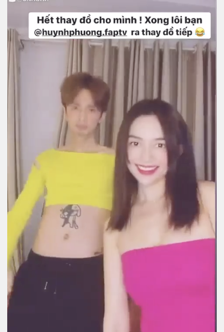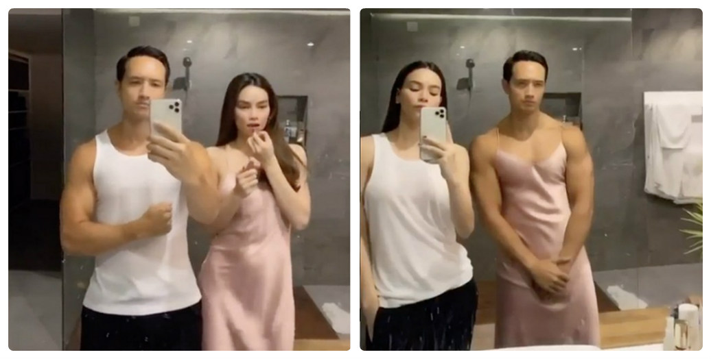 Tuy nhiên, chỉ trong tích tắc, cả hai hoán đổi giới tính cho nhau. Hà Hồ diện đồ của Kim Lý và ngược lại, Kim Lý lại cực hài hước trong đầm hồng của bạn gái. Khoảnh khắc này khiến ai nấy phải cười bò. Chính Hồ Ngọc Hà cũng phải thừa nhận: "Ở nhà miết mà giới tính rối loạn hết".