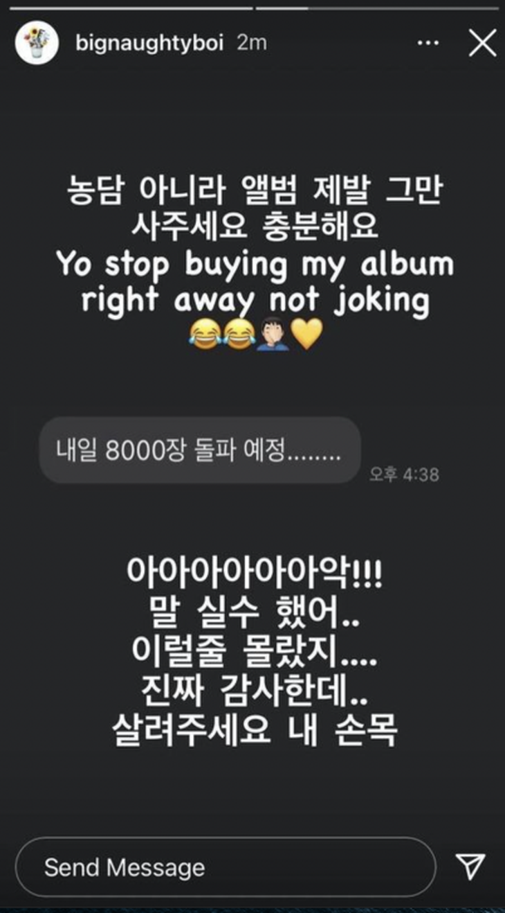 Hóa ra, số lượng fan đặt mua trước album của nam rapper đã vượt qua con số 8.000 bản và không ngừng tăng lên từng giờ. Đây tuy chưa phải là con số lớn với một nghệ sĩ Kpop nhưng hãy tưởng tưởng, nếu bạn là Big Naughty và phải ngồi ký tay lên từng bản album để thực hiện được lời hứa với fan thì kết quả rất có thể nam idol sẽ kiệt sức mất.