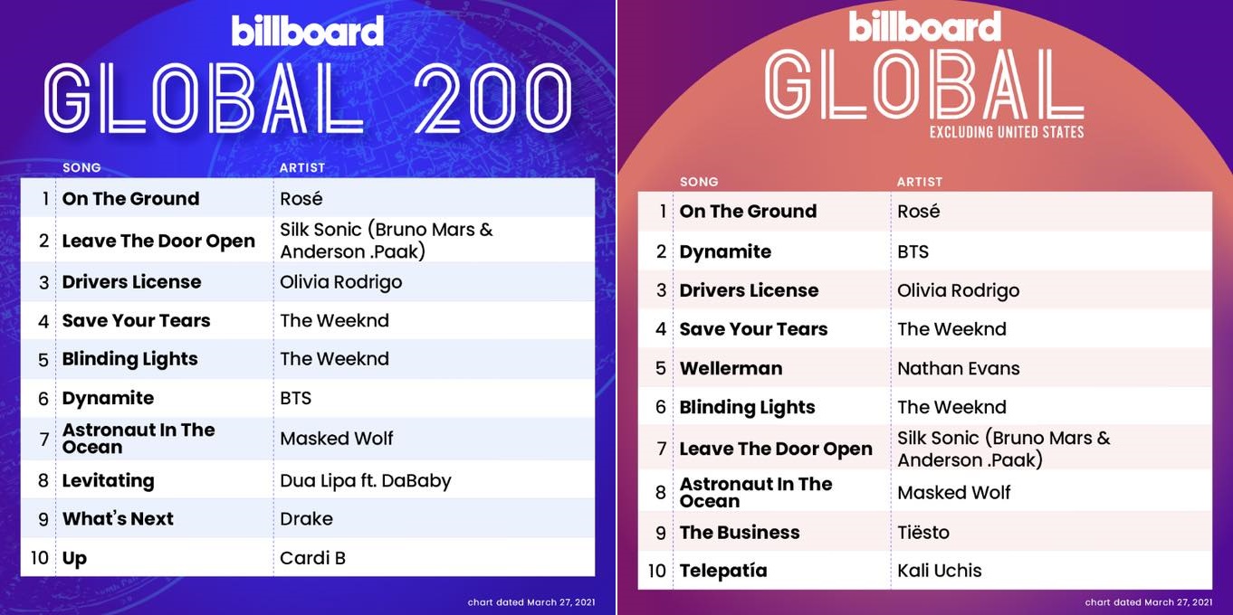 Ca khúc solo On the ground của Rosé (Blackpink) đã đạt No.1 trên cả hai BXH Billboard Global 200 và Billboard Global Excl. U.SVới thành tích này của On the ground, Rosé đã làm nên kỳ tích ngoài sức tưởng tượng để mang về thành tích cao nhất từ trước đến nay cho một nghệ sĩ nữ solo Kpop trên BXH Billboard Hot 100. Và Rosé cũng là nghệ sĩ nữ solo Kpop thứ hai trong lịch sử đặt chân lên được BXH này.