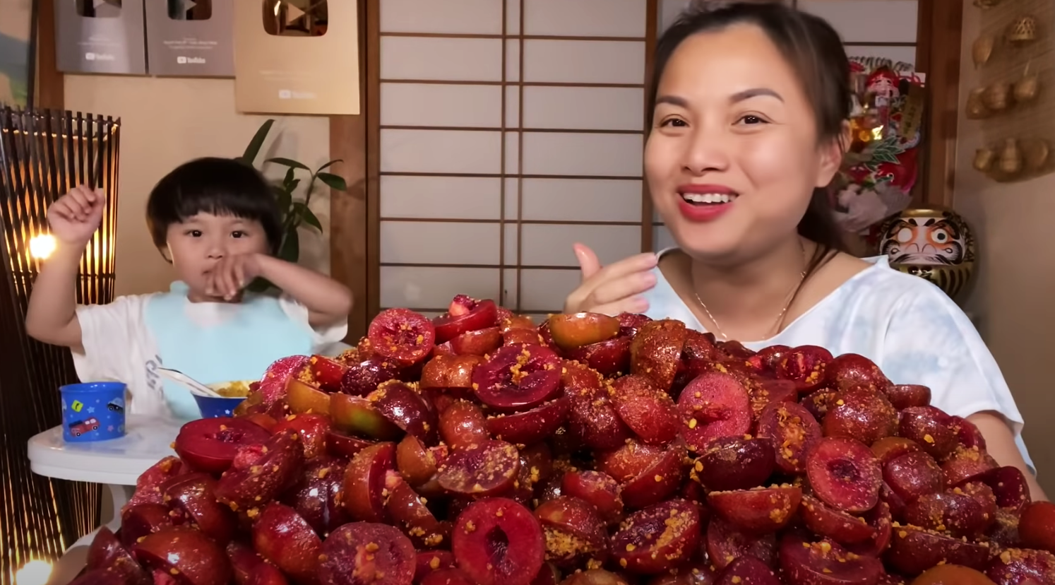 Làm mâm mận khổng lồ để thoả nỗi nhớ quê và thèm món ăn vặt của Việt Nam mình quả là một cao kiến.Theo nữ vlogger, tuy mận được mua từ siêu thị Việt Nam tại Nhật nhưng không ngon bằng mận tại quê nhà. Tiết lộ "tài chính" để cho ra lò mâm mận khổng lồ trên xứ sở Mặt trời mọc, Quỳnh Trân cho biết cô tốn khoảng 1 triệu đồng cho 4 kg mận, lá chuối, muối tôm Tây Ninh, ớt...