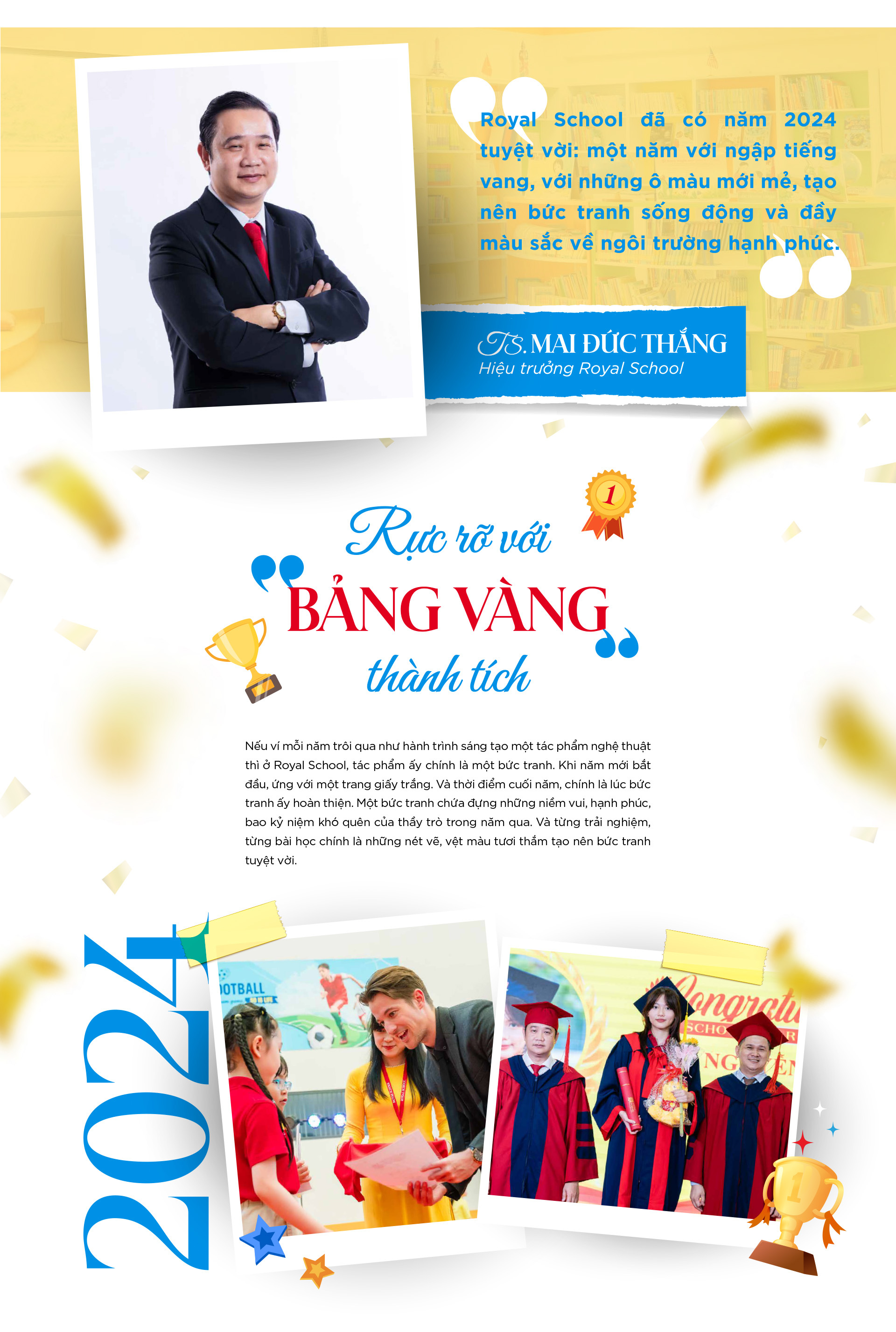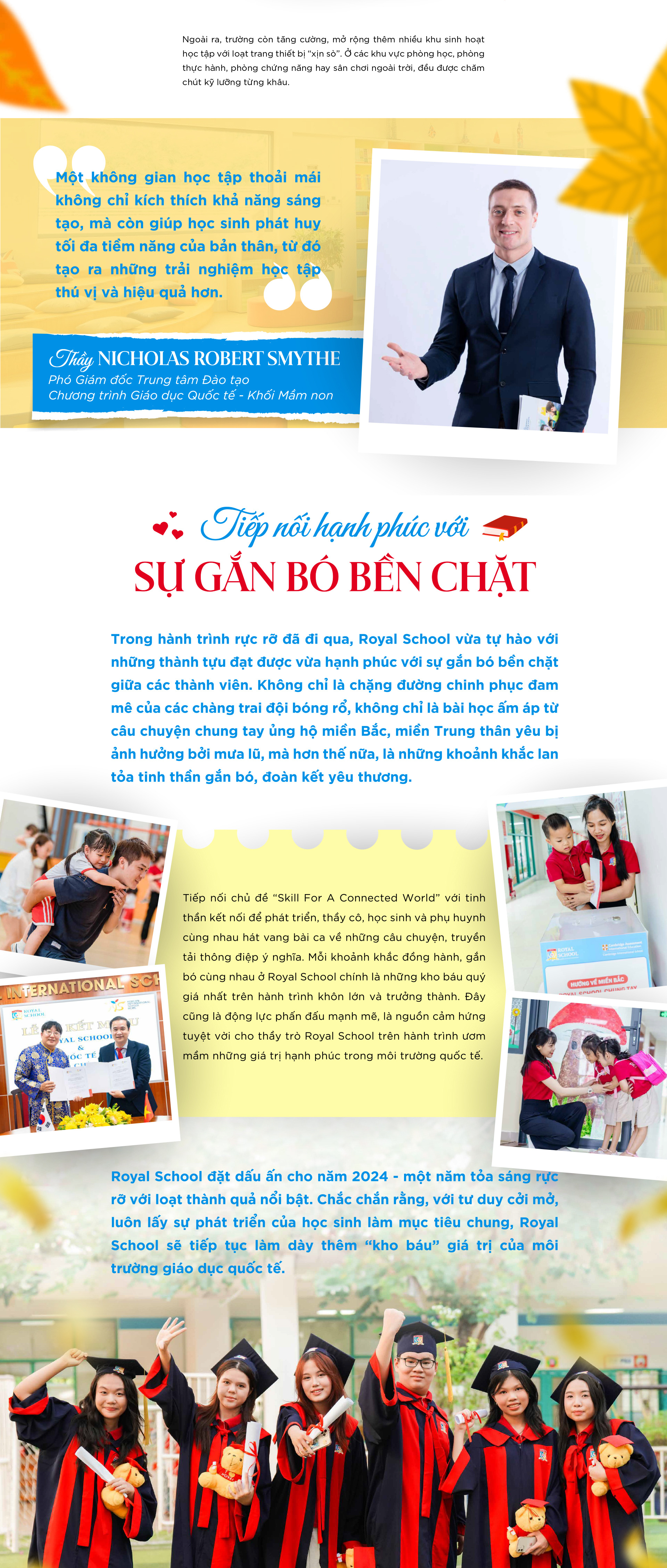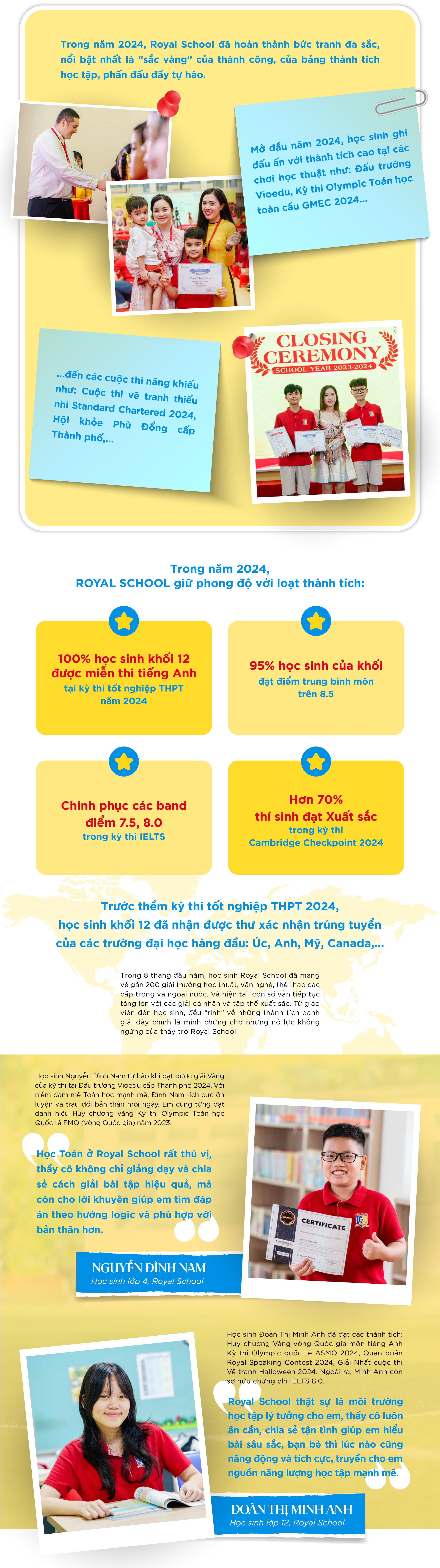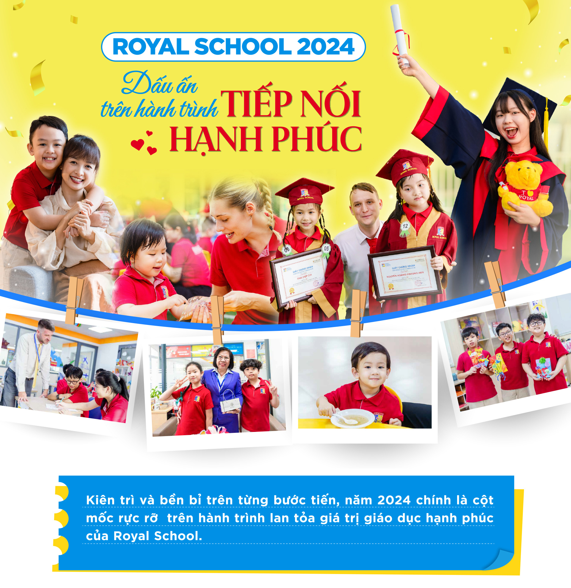 Với bước đệm vững chắc từ thành công của năm trước, trường tiếp tục gặt hái nhiều thành quả mới, ngày càng khẳng định vị thế, tầm nhìn và sức mạnh của môi trường quốc tế. Đầu năm 2024, học sinh Royal School để lại ấn tượng với bản lĩnh của công dân toàn cầu cùng chủ đề "I Am A Global Citizens", bằng loạt thành tích nổi bật, từ học thuật đến văn hoá, văn nghệ. Đến giữa năm 2024 là sự "bùng nổ" tinh thần sáng tạo qua loạt ý tưởng độc đáo trong mùa hè "Creative Campers", hay những nỗ lực tuyệt vời trong kỳ thi Tốt nghiệp, trong các kỳ thi chứng chỉ. Và cuối năm 2024, với chủ đề "Skill For A Connected World", các thành viên tạo nên sức ảnh hưởng mạnh mẽ khi gắn bó, cùng chia sẻ và lan tỏa bài học kết nối.