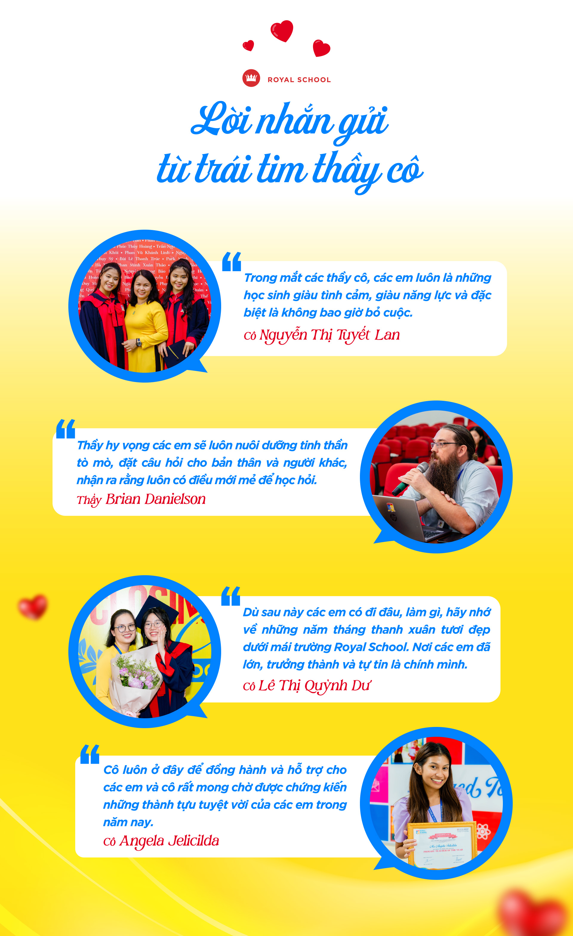 "Đã có thời điểm em gặp phải những khó khăn, nhất là trong giai đoạn cuối cấp. Nhưng nhờ có thầy cô Royal School liên tục động viên, em đã gỡ được nút thắt cảm xúc, phát triển mạnh mẽ hơn.". - Cựu học sinh Võ Bảo An (đang làm việc trong ngành phần mềm tại ngân hàng top đầu Việt Nam) luôn biết ơn tình yêu thương và lời khuyên hữu ích từ thầy cô trong suốt quá trình học tập ở Royal School.
