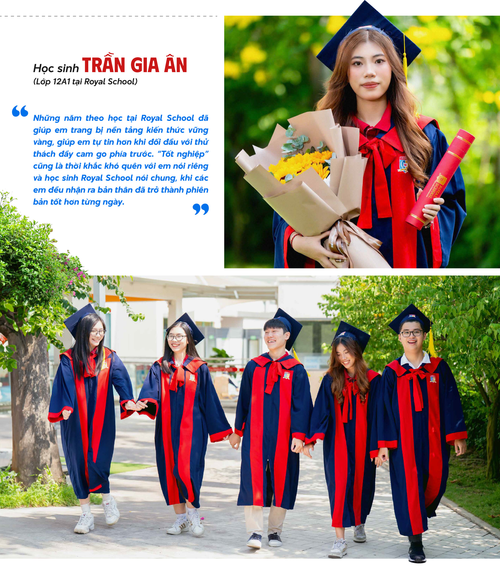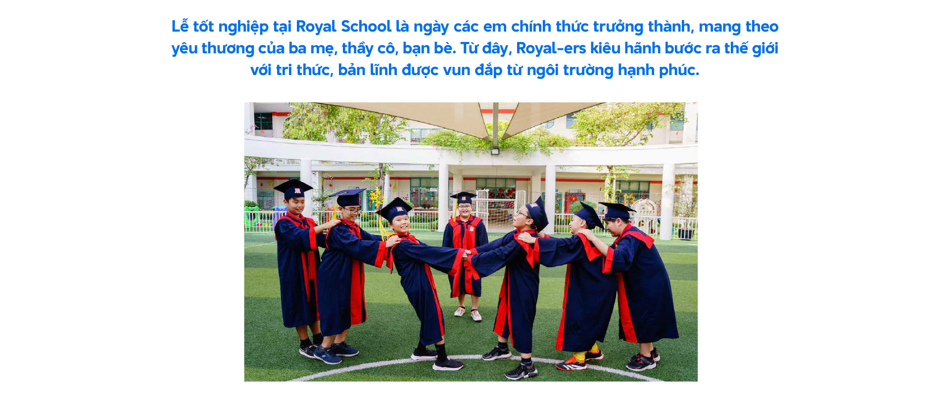 Ở Royal School, tốt nghiệp còn mang một ý nghĩa riêng, là nơi ấp ôm những cảm xúc thiêng liêng của các thành viên: sự tự hào của ba mẹ dành cho con, sự biết ơn của gia đình dành cho nhà trường vì đã dạy dỗ và giúp con trưởng thành, là vòng tay nắm chặt của bạn bè khoảnh khắc "tạm xa nhau"...