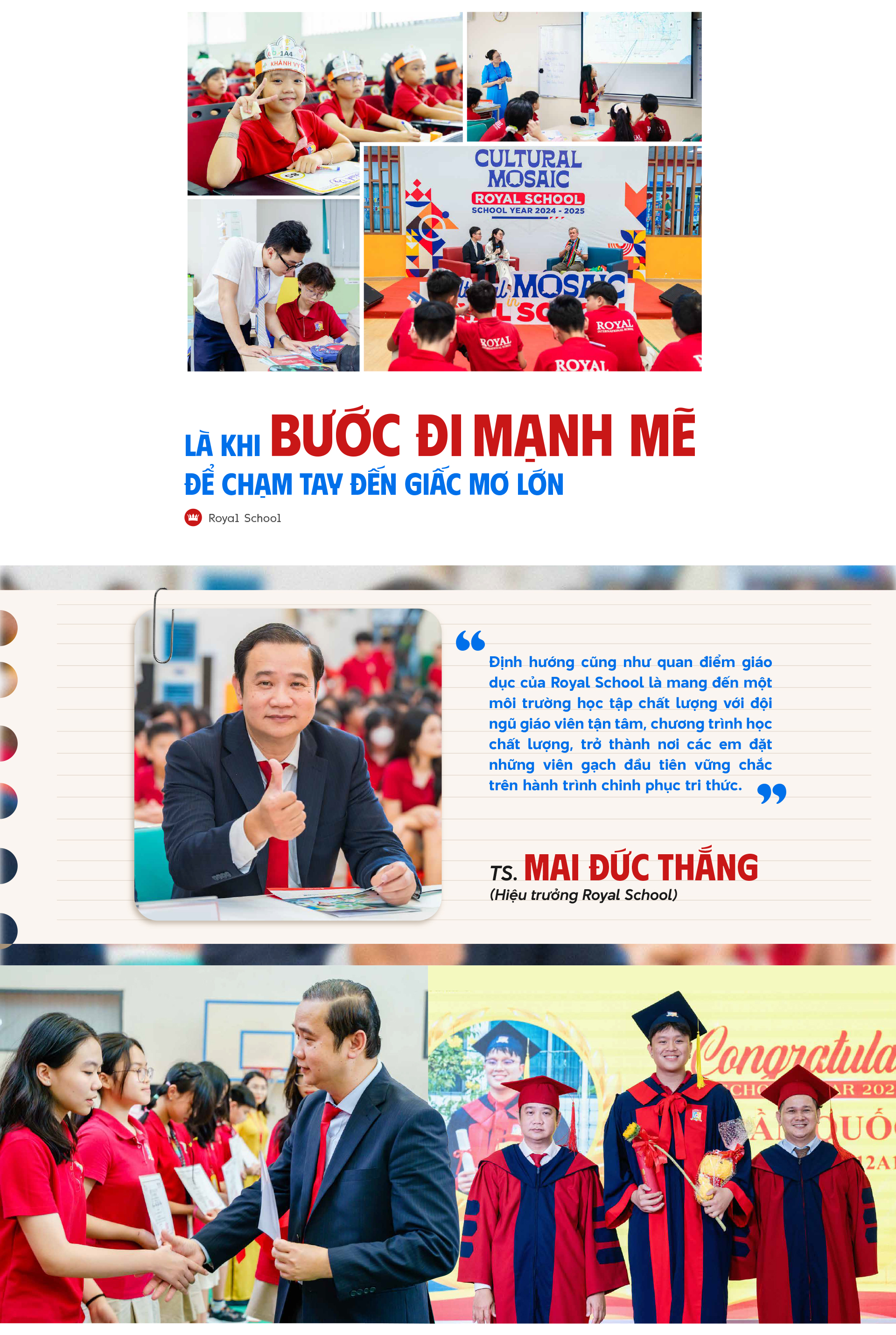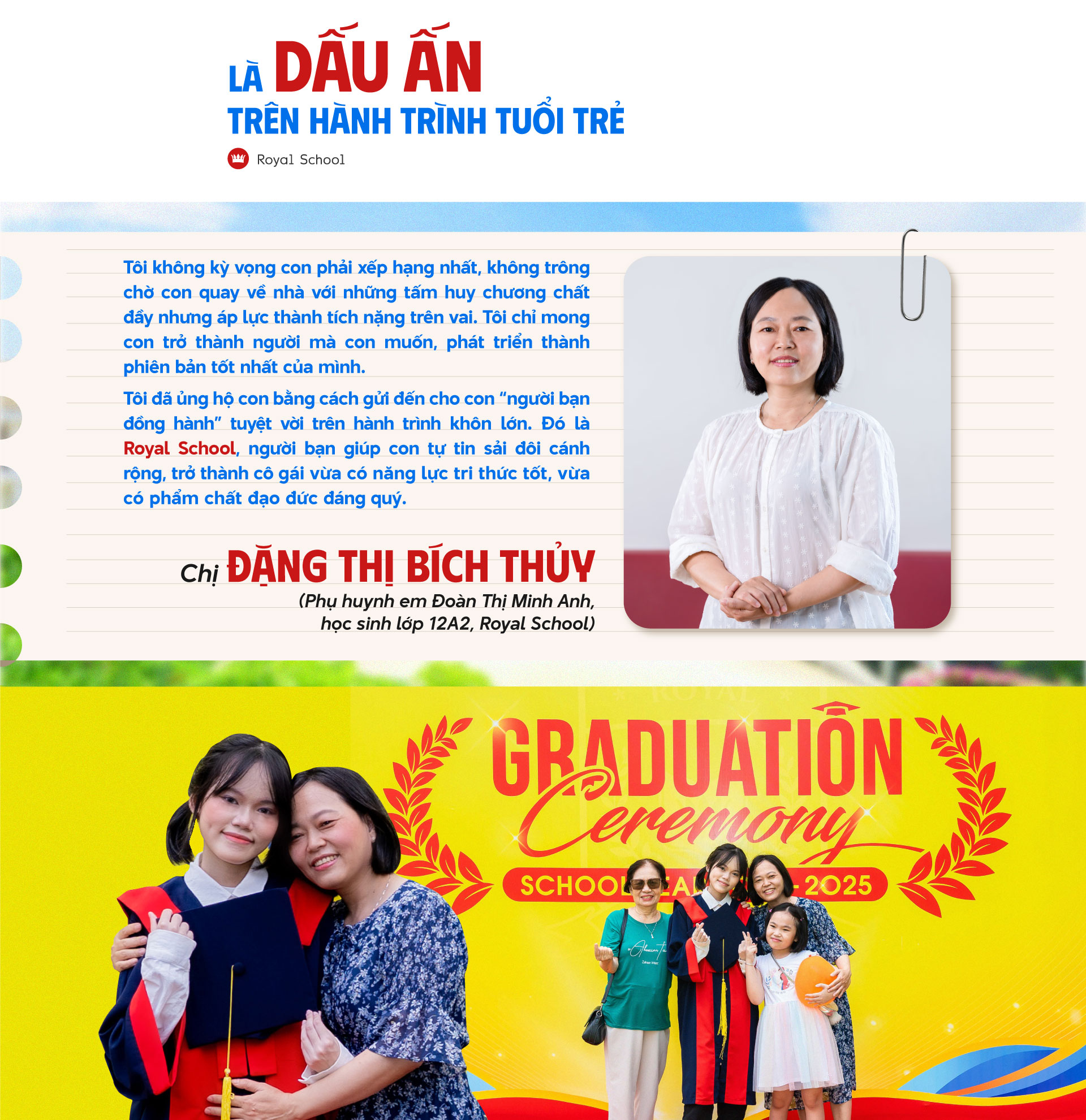 Tham dự buổi lễ tốt nghiệp, nhìn thấy con mặc áo choàng, đội mũ vuông và ôm chầm lấy bạn bè với nụ cười hạnh phúc, không riêng chị Bích Thủy mà tất cả phụ huynh Royal School nói chung đều xúc động trước khoảnh khắc "Con đã LỚN!". Lớn cùng với những năm tháng học tập tích cực, theo đuổi tri thức hết mình dưới mái trường quốc tế hiện đại. Lớn với bài học về sự khiêm nhường, tự tin, tôn trọng lẫn nhau và tình yêu thương của ba mẹ, bạn bè, thầy cô.