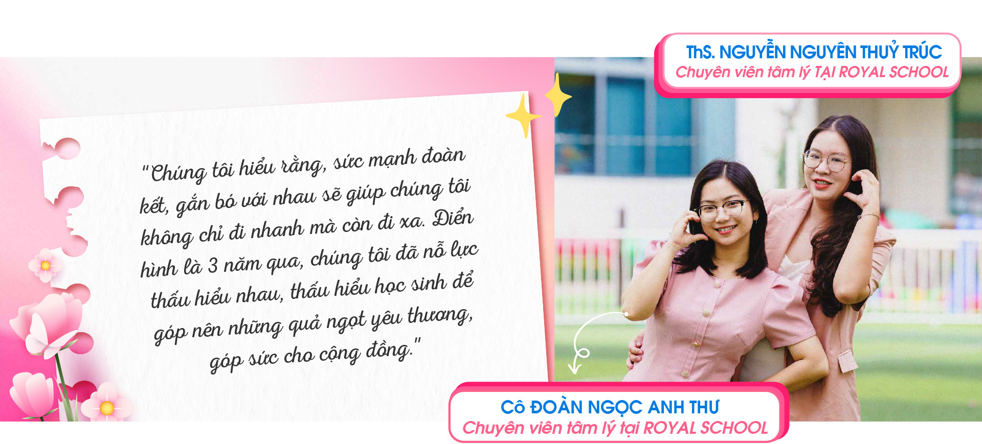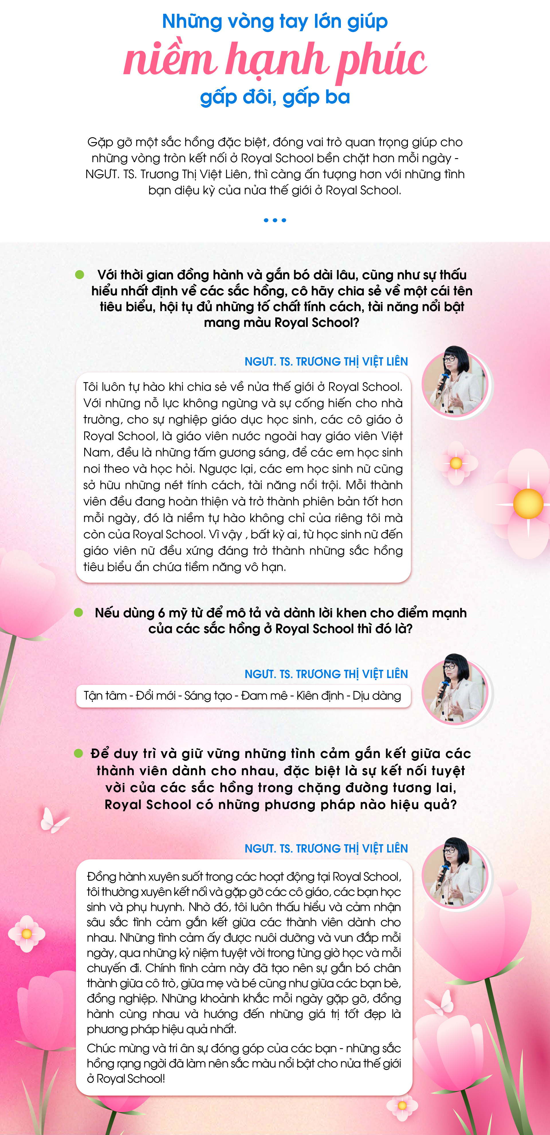 Cùng sự dịu dàng, sự thấu hiểu, những sắc hồng ở Royal School đã dìu dắt, nâng đỡ nhau, làm nên sức mạnh gắn kết diệu kỳ. Một sự diệu kỳ biểu trưng của tình bạn, tình thầy trò, tình đồng nghiệp, tình chị em, một sức mạnh làm nên dáng hình riêng cho phái nữ ở Royal School.