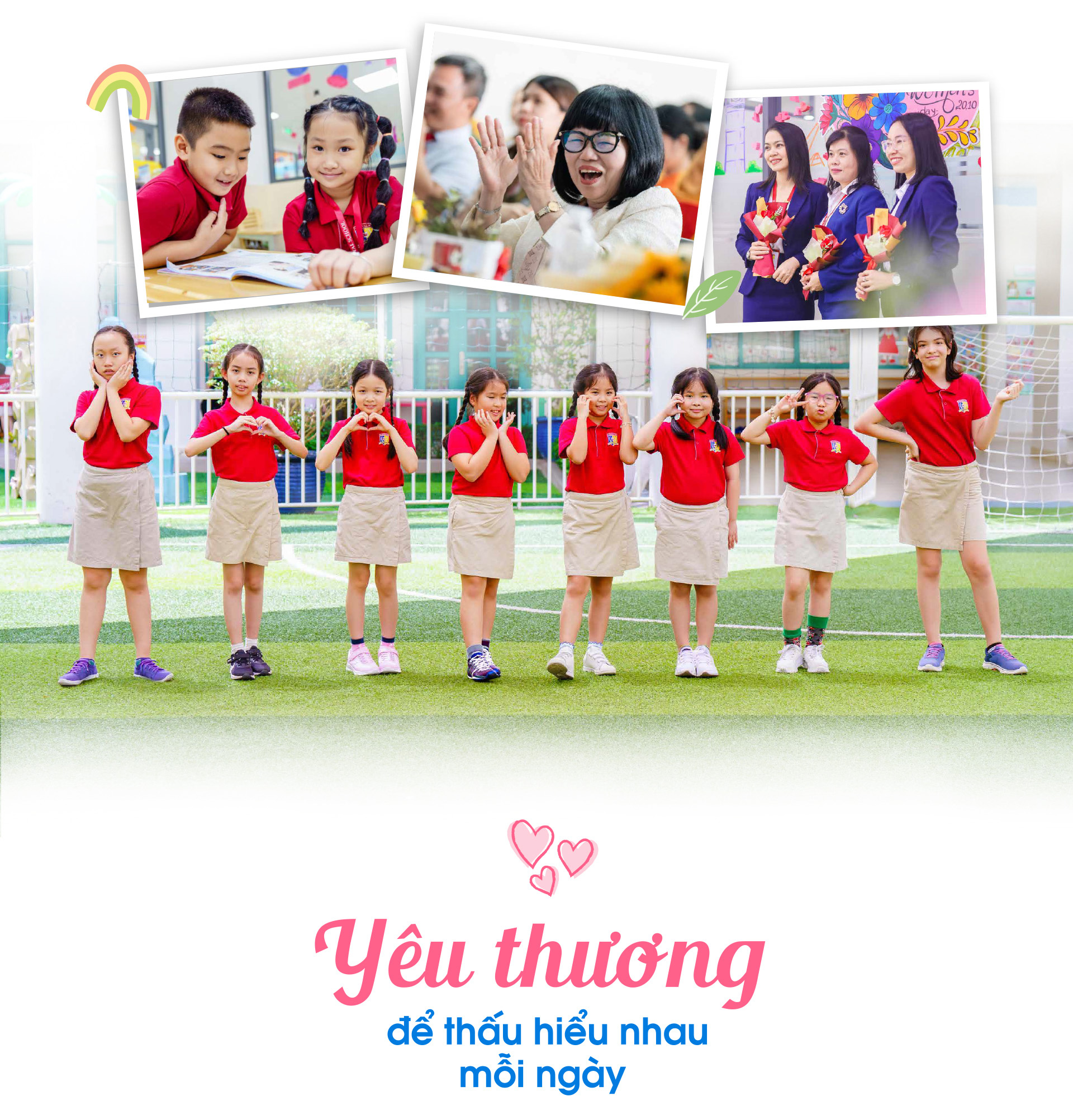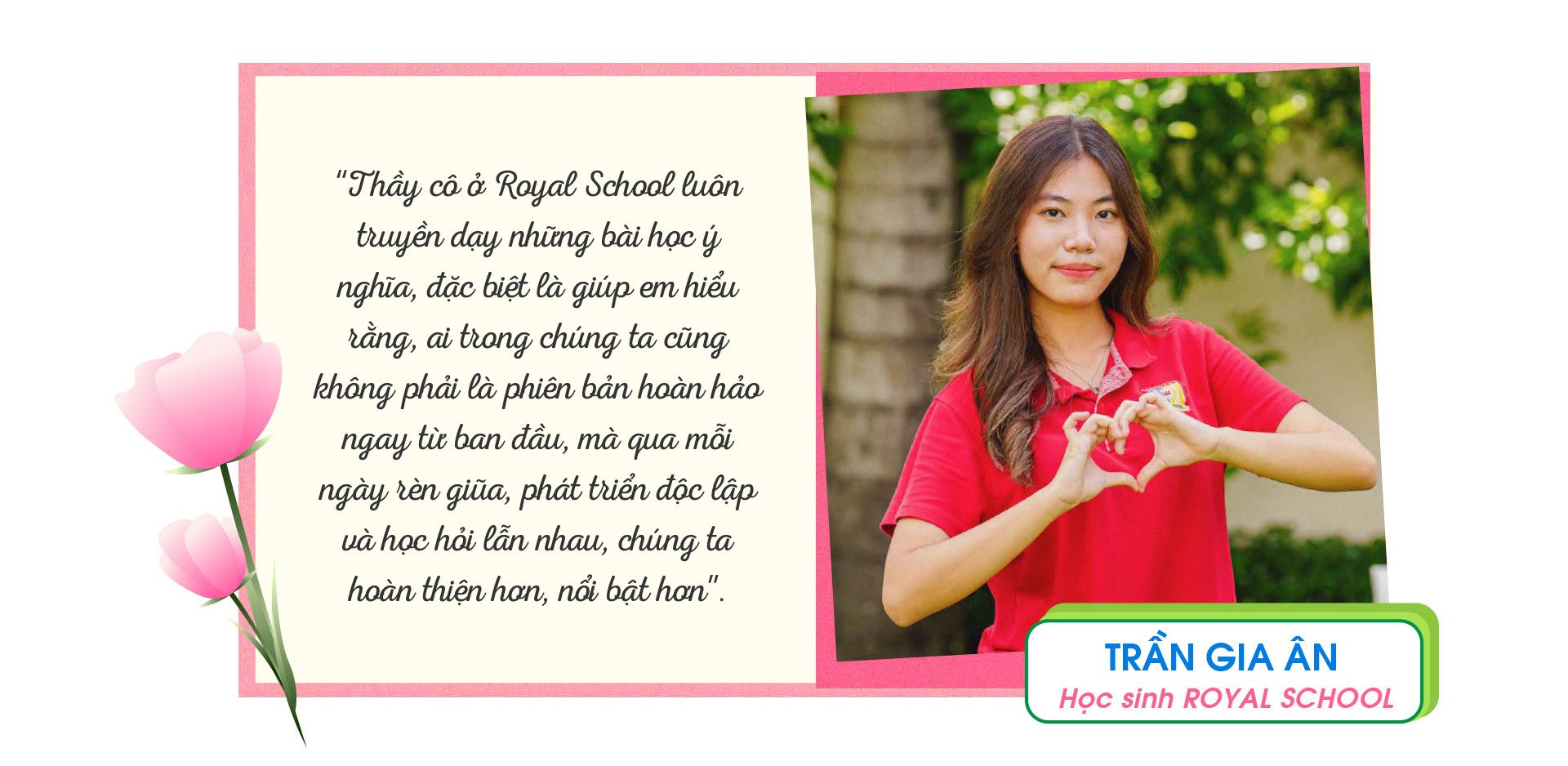 Ở Royal School, mỗi học sinh luôn được truyền cảm hứng về một môi trường học tập tôn trọng, thấu hiểu và yêu thương. Tôn trọng cá tính của nhau, thấu hiểu điểm mạnh hay chưa hoàn hảo của người bạn đồng hành, từ đó, yêu thương và chia sẻ, giúp nhau tốt hơn và chinh phục mọi thử thách. Các sắc hồng cũng từ đó mà mạnh dạn tỏa sáng cùng năng lực và thế mạnh nổi trội, những nét cá tính của riêng nửa thế giới.