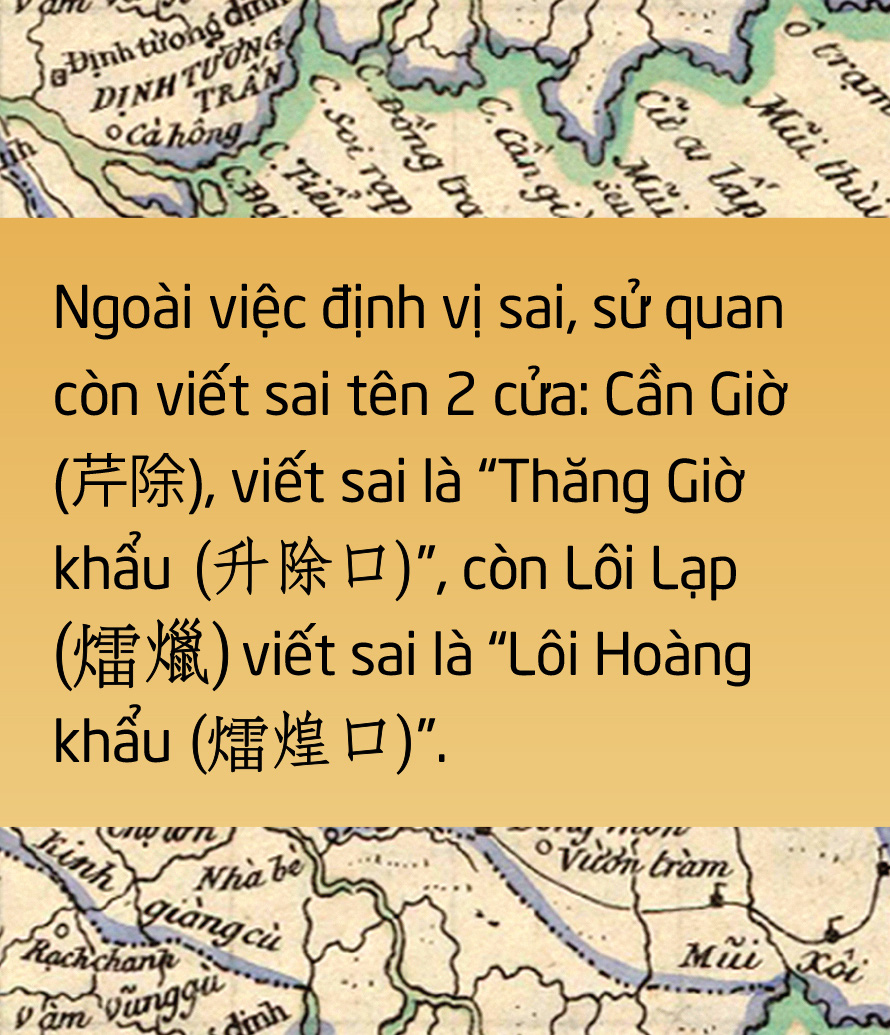 (嘉定) và tên 3 cửa biển. Nói về tên 3 cửa biển, Taberd tiêu danh đúng vị trí, theo thứ tự bắc vào nam: Cần Giờ-Đồng Tranh-Soi Rạp; sử quan tiêu danh sai vị trí: Cần Giờ-Lôi Lạp-Đồng Tranh.