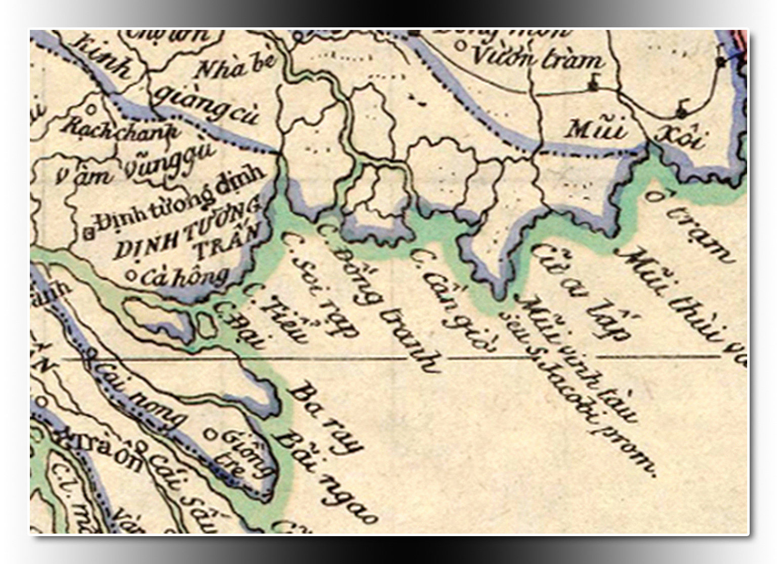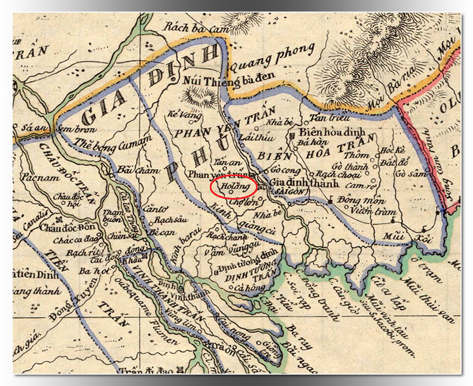 Khu vực Sài Gòn ghi mấy tên, gồm: "Gia Định thành (SÀI GÒN)", "Phan yên trấn", "Nhà bè", "Chợ lớn", "Holăng", "Tấn an", "C. Cần giờ", "C. Đồng tranh", "C. Soi rạp".