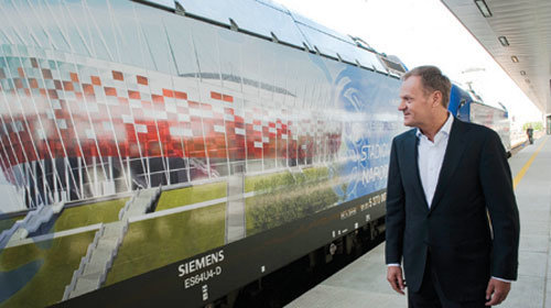 TTCT - Một số xe lửa ở Ba Lan đã được vẽ hình ảnh của những sân vận động tổ chức các trận đấu Euro 2012 bên ngoài toa tàu. Trong ảnh là Thủ tướng Ba Lan Donald Tusk đang xem một chiếc xe lửa được vẽ hình sân vận động Euro 2012. Phóng to Tags: Xe lửaEuro 2012Bên lề EuroDonald Tusk