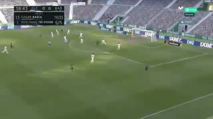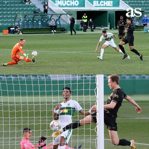 Tiền vệ Frenkie de Jong có pha lao vào cướp trắng trợn bàn thắng của hậu vệ Elche.Trong lúc tất cả tưởng như đã được chứng kiến pha đốt lưới của cầu thủ đội chủ nhà, thì bất ngờ, Frenkie de Jong lao vào đệm bóng cận thành dù gần như bóng chắc chắn sẽ bay vào lưới.ư