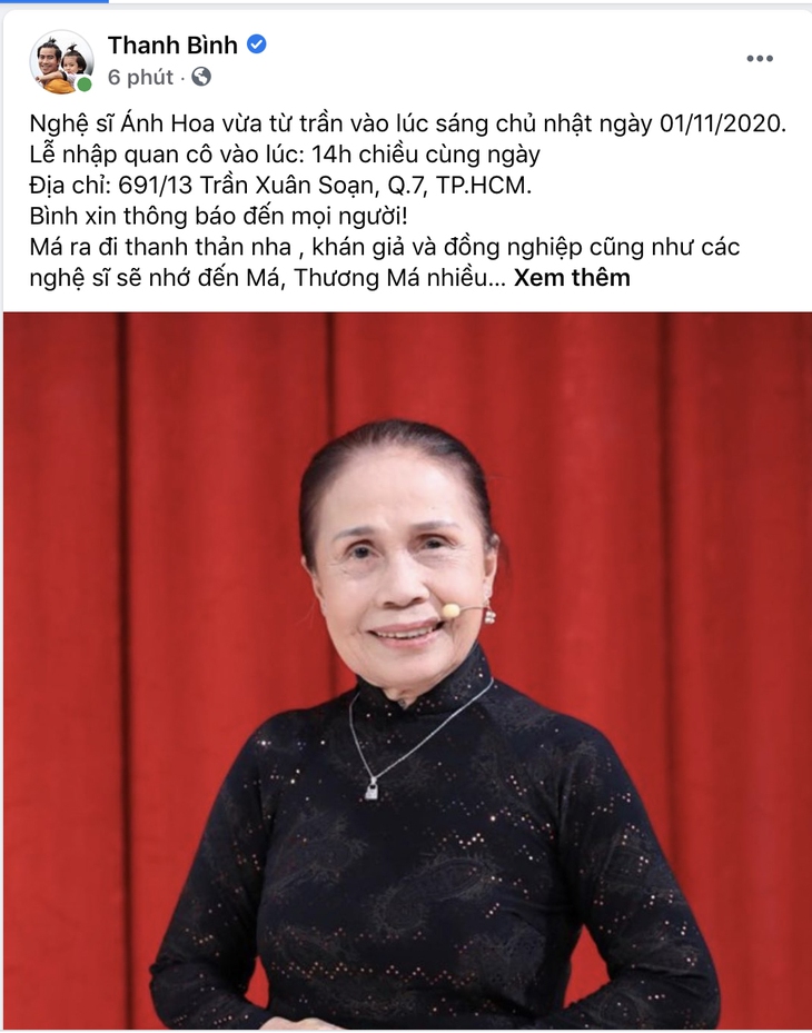 Nghệ sĩ Ánh Hoa đã qua đời sau thời gian điều trị tai biến mạch máu não.Gia đình nghệ sĩ Ánh Hoa thông báo bà đã qua đời lúc 12h ngày 1-11 tại nhà riêng. Trước đó, bà từng điều trị bệnh tai biến mạch máu não tại Bệnh viện Tân Hưng (Quận 7, TP.HCM).