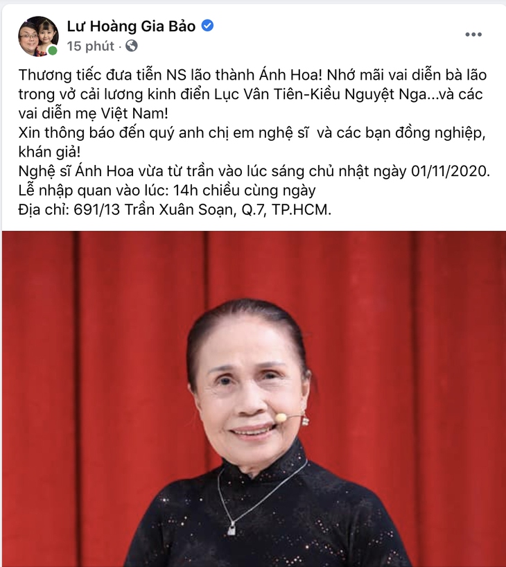 Các sao Việt đồng loạt đăng tải dòng trạng thái tiễn biệt nghệ sĩ Ánh Hoa