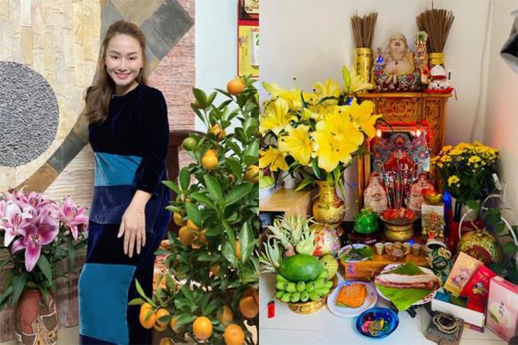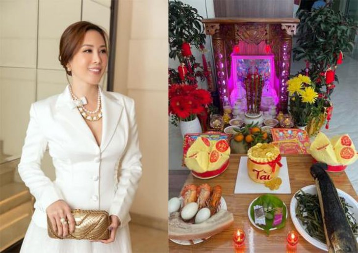 Vợ chồng Thu Trang - Tiến Luật cũng chuẩn bị mâm cỗ cúng thịnh soạn với heo quay, xôi, chè, bánh hũ vàng... Nữ diễn viên cầu mong một năm thành công, thuận lợi đến với công ty và gia đình.