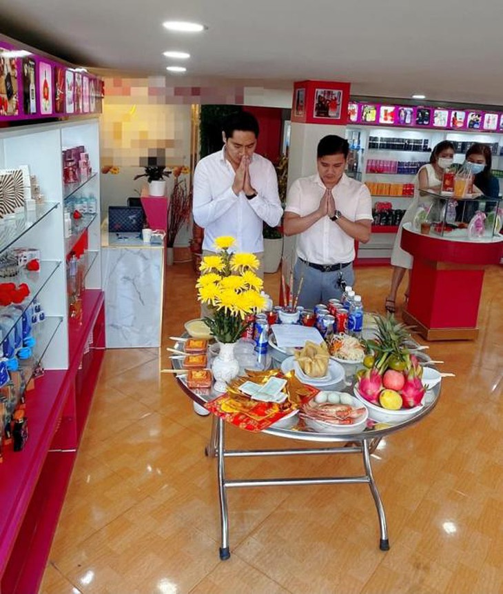 Minh Luân cùng các nhân viên tại công ty chuẩn bị mâm cúng đủ lễ và vô cùng thịnh soạn