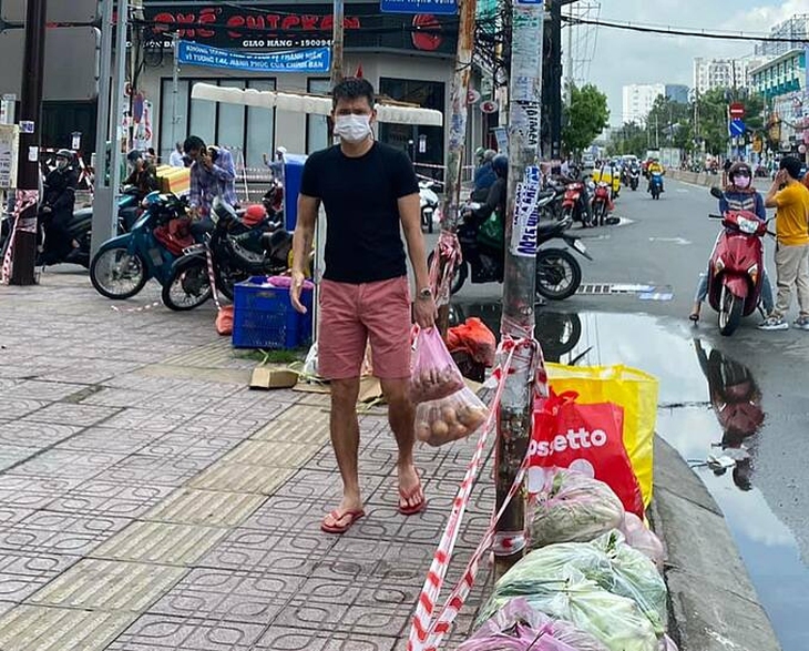 Ở một hoàn cảnh khác cũng trong ngày phong toả cao điểm, Công Vinh gây bất ngờ khi diện style rất dân dã, xỏ xép lê phụ vợ phát quà từ thiện mùa dịch.