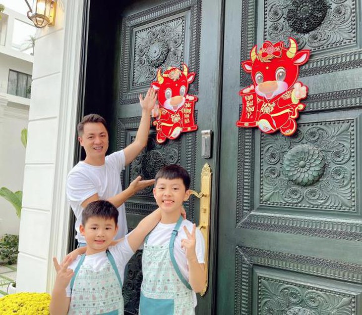 Các nhóc tỳ cùng bố dọn ghế sofa, treo chữ và hình những chú trâu năm Tân Sửu trong phòng khách, cửa ra vào trở nên bắt mắt hơn.