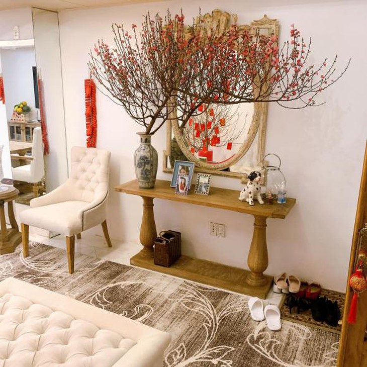 Căn phòng rực rỡ nhưng vẫn giữ được nét thanh lịch, tinh tế. Dù không gian mang chất Châu Âu, song Phan Như Thảo vẫn khéo kết hợp một số món đồ mang chút truyền thống để thêm vẻ ấm cúng.Ngoài các loại cây cảnh quen thuộc thì năm nay thanh liễu, tuyết mai cũng được nhiều sao Việt "phải lòng".