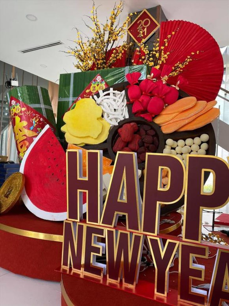 Giữa nhà là một mô hình khổng lồ với khung bánh chưng, hoa mai, dưa hấu... thích hợp cho việc chụp ảnh "sống ảo".