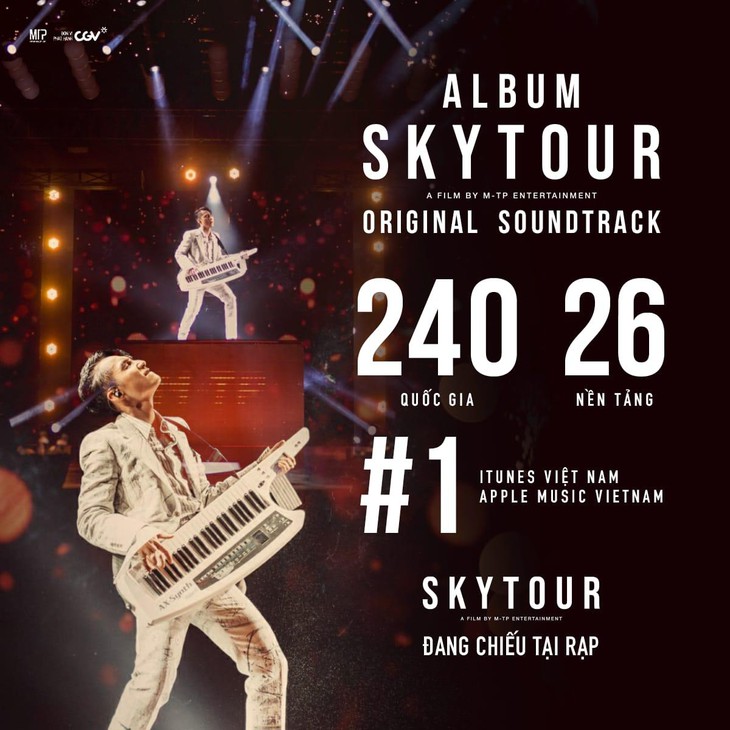 Sơn Tùng lập thành tích đáng nể sau 3 ngày công chiếu Sky tour movie.Ngày 16-6, album nhạc phim Sky tour movie của Sơn Tùng M-TP đã chính thức được phát hành trên 26 nền tảng nghe nhạc trực tuyến tại 240 quốc gia và vùng lãnh thổ. Nổi bật trong đó là Spotify, Apple Music, iTunes, Deezer, Google Play…