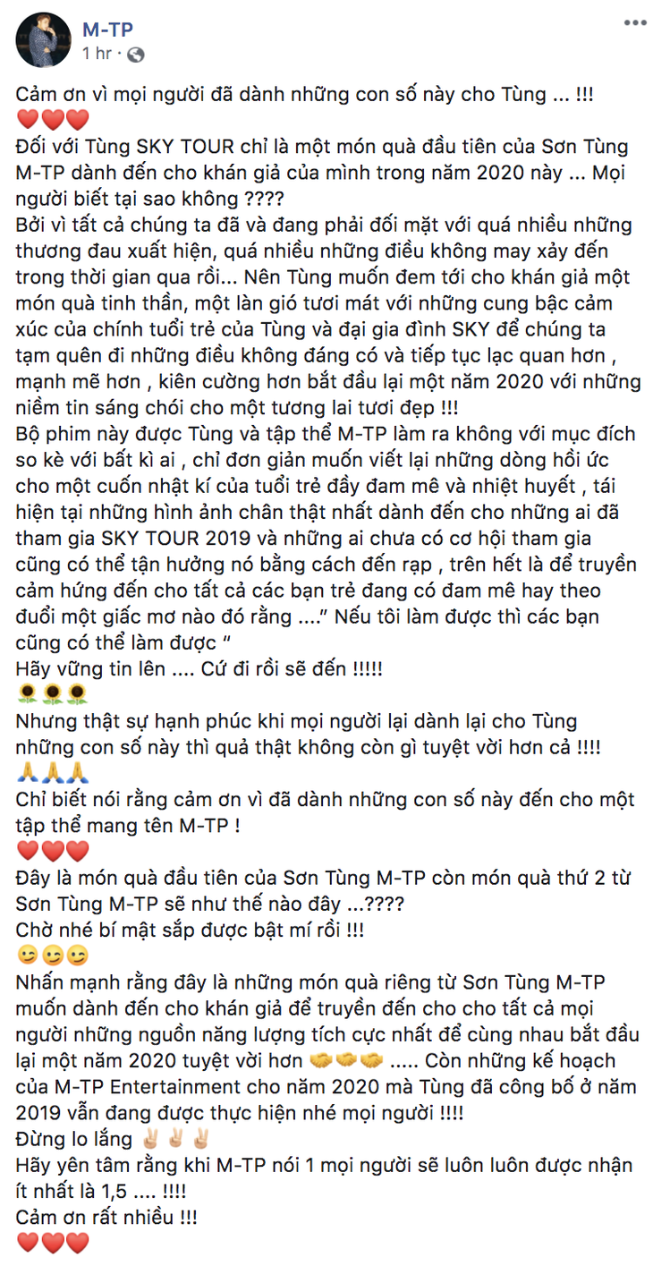 Sau những thành tích này, Sơn Tùng bất ngờ tiết lộ, Sky tour movie chỉ là món quà đầu tiên dành tặng fan trong năm 2020, món quà thứ hai gửi đến các fan sắp được bật mí. Đồng thời, Sơn Tùng M-TP khẳng định, những kế hoạch mà công ty M-TP Entertainment từng công bố vào dịp cuối năm 2019 vẫn đang được thực hiện. “Hãy yên tâm rằng khi M-TP nói 1, mọi người sẽ luôn được nhận ít nhất 1,5” - Sơn Tùng M-TP viết.