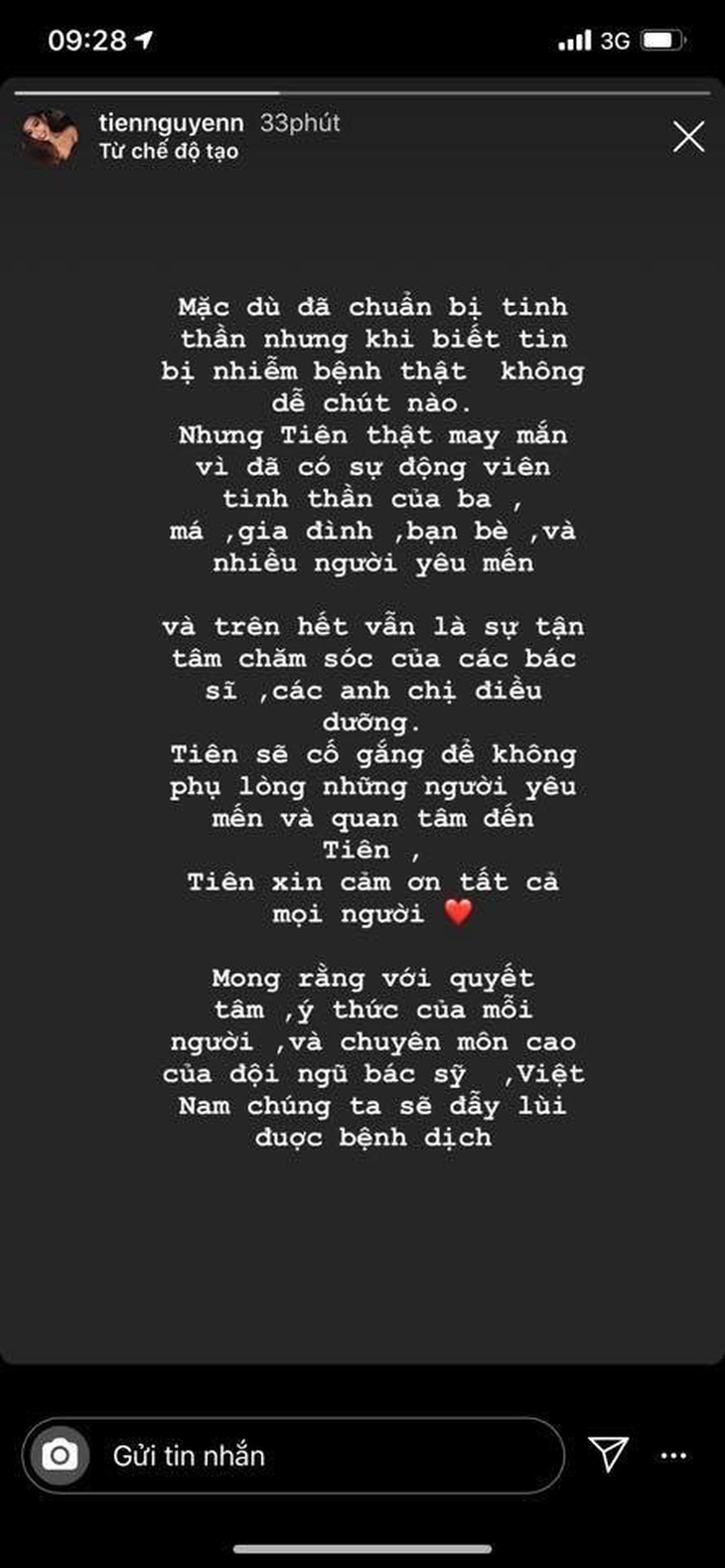 Tuy nhiên, mới đây, trên trang cá nhân ở Instagram, Tiên Nguyễn đã có những chia sẻ đầu tiên kể từ khi về nước trị bệnh: "Mặc dù đã chuẩn bị tinh thần nhưng khi biết tin nhiễm bệnh thật không dễ chút nào.