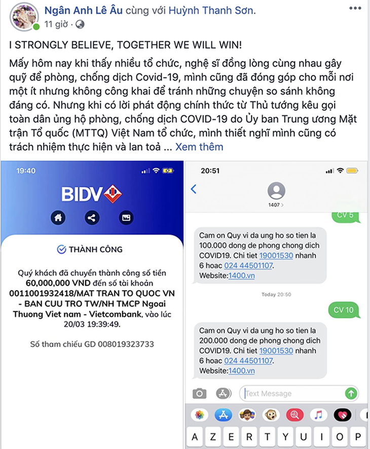 Hoa hậu Đại dương Lê Âu Ngân Anh đã đóng góp 60 triệu đồng qua hình thức chuyển khoản để hỗ trợ Chính phủ trong công tác phòng, chống dịch Covid-19. Cô cũng kêu gọi mọi người chung sức trong giai đoạn khó khăn này.