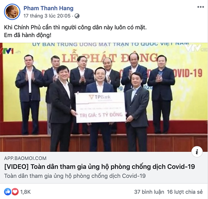 Siêu Mẫu Thanh Hằng đã ủng hộ ngay khi phát động ủng hộ chống dịch covid-19