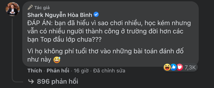 Nội dung đáp án được Shark Bình đưa ra như sau: "Bạn đã hiểu vì sao chơi nhiều, học kém nhưng vẫn có nhiều người thành công ở trường đời hơn các bạn top đầu lớp chưa? Đó là vì họ không phí tuổi thơ vào những bài toán đánh đố như này".