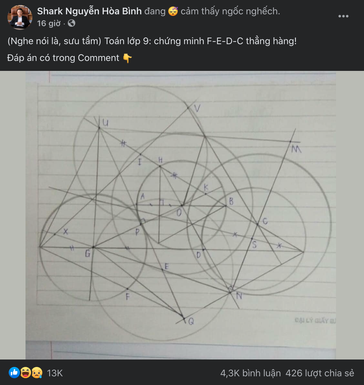 Bài toán hình thu hút lượng tương tác khủng của Shark Bình, được dân tình chia sẻ lia lịa. (Ảnh chụp màn hình)Theo đó, chẳng để dân tình phải mò mẫm đi tìm lời giải khi bài viết đã tiết lộ có đáp án ngay dưới phần bình luận.