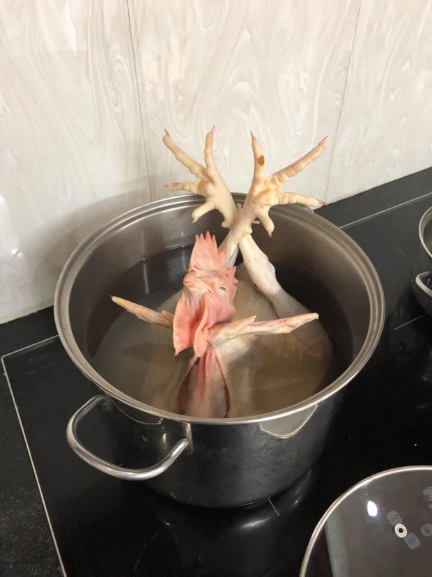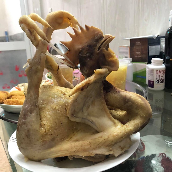 Chú gà trống được buộc "kiểu chầu" vô cùng đẹp mắt.Theo nhiều dân mạng chỉ ra, cô gái có thể đã luộc gà không đúng cách khi phần da bụng bị rách nhiều và phần đầu... thâm đen quá mức. Để làm được một chú gà cúng hoàn hảo, luộc gà cũng phải có "cách this cách that" thì thành phẩm mới hoàn hảo, mãn nhãn phần nhìn.