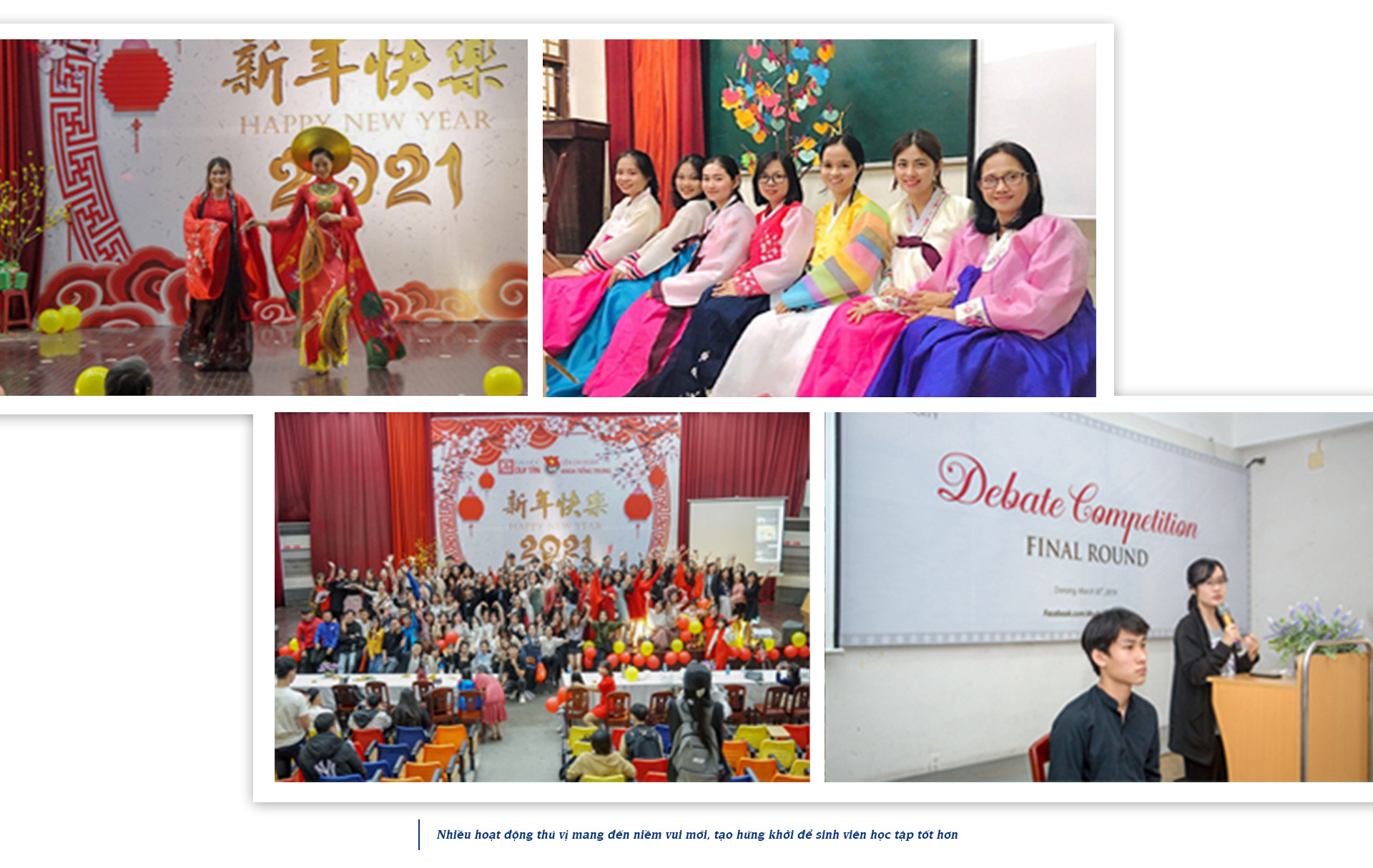 Ở khoảng trời riêng của Trường Ngoại ngữ, ĐH Duy Tân, còn có thể bắt gặp rất nhiều những hoạt động vui tươi mang đậm bản sắc văn hóa Trung Quốc, Anh Quốc, Hàn Quốc hay Nhật Bản. Sẽ được thỏa sức ngắm nhìn những nam thanh, nữ tú của Trường Ngoại ngữ trong các bộ trang phục truyền thống của các quốc gia ngay trong Lễ chào đón Sinh viên Khóa đầu Nhập học hay trong các hoạt động ngoại khóa, giao lưu,…