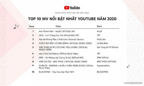 Sơn Tùng M-TP lẫn Jack đều bị HuyR đánh bại trong 'Top 10 MV nổi bật nhất YouTube 2020'