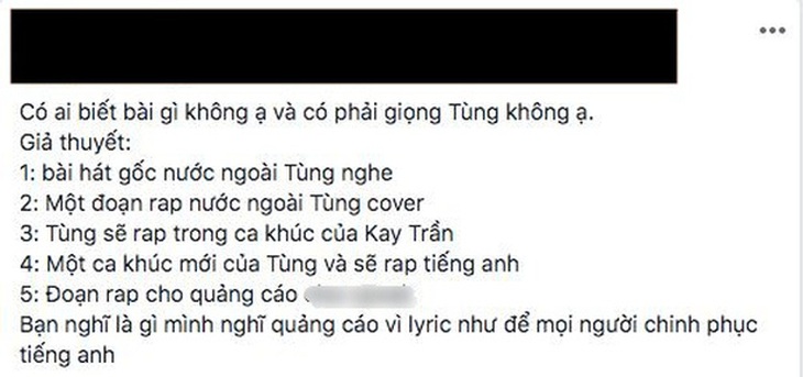Chưa dừng lại ở đó, trên group cộng đồng Sky - FC của Sơn Tùng M-TP, một nghi vấn khác được đặt ra. Họ nghĩ đây là một đoạn rap nước ngoài được Sơn Tùng M-TP cover hoặc cũng có khả năng lần này nam ca sĩ sẽ bắt tay "gà cưng" Kay Trần để làm điều gì đó thật hay ho.