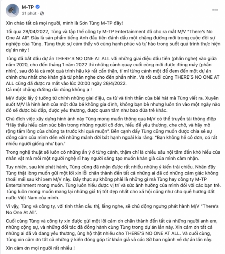 Ít phút trước, trên trang fanpage của Sơn Tùng M-TP đã đăng tải thông báo chính thức với nội dung ngưng MV There's no one at all vừa được ra mắt tối 28-4 vừa qua. Cũng trong thông báo này, nam ca sĩ chia sẻ về quãng thời gian 2 năm sản xuất MV cũng như tâm huyết mà mình đặt vào sản phẩm mới này.