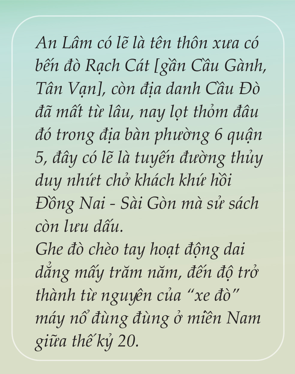 Đường thủy hay đò dọc từ Sài Gòn đến Biên Hòa xa, sách Phủ biên tạp lục (1776) chép "Bến đò An Lâm đi Sài Gòn, thuế mỗi năm 89 quan 3 mạch", còn Gia Định thành thông chí (1820) chép "Bến đò phía bắc ở bến Rạch Cát thuộc dinh Trấn Biên, bến đò phía nam ở tổng Tân Long dinh Phiên Trấn (tục danh Cầu Đò), địa phận thôn Tân Hương".