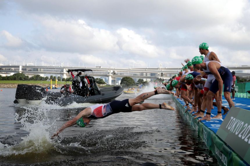 6h30 sáng 26-7 theo giờ Tokyo, 56 VĐV tại Vịnh Tokyo đã sẵn sàng cho chặng bơi 1.500m mở đầu của nội dung thi 3 môn phối hợp nam (bơi - đạp - chạy). Song, sau khi có hiệu lệnh xuất phát, gần một nửa VĐV không thể bắt đầu phần thi, do bị thuyền máy của đài truyền hình chắn ngang đường đua.