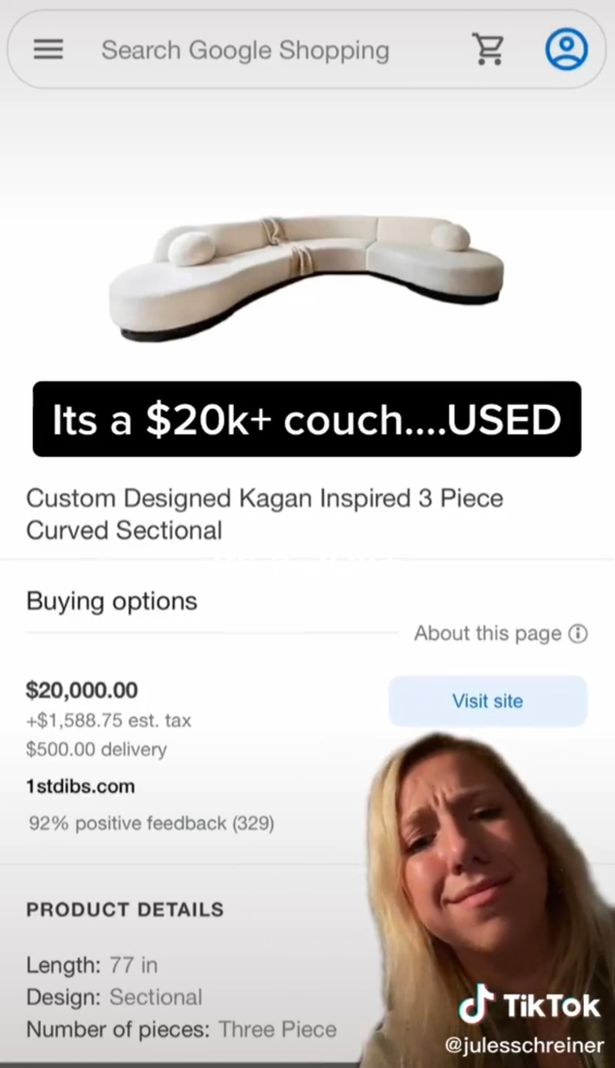 Cũng trong đoạn video đăng lên TikTok, chị Jules Schreiner chia sẻ hình ảnh một chiếc sofa khác, cũng đang được khuyến mại với giá hàng ngàn USD. Theo giải thích của chị, thì chiếc sofa chị lỡ bán lầm cũng của nhà thiết kế này, chỉ là được làm theo một phong cách khác.