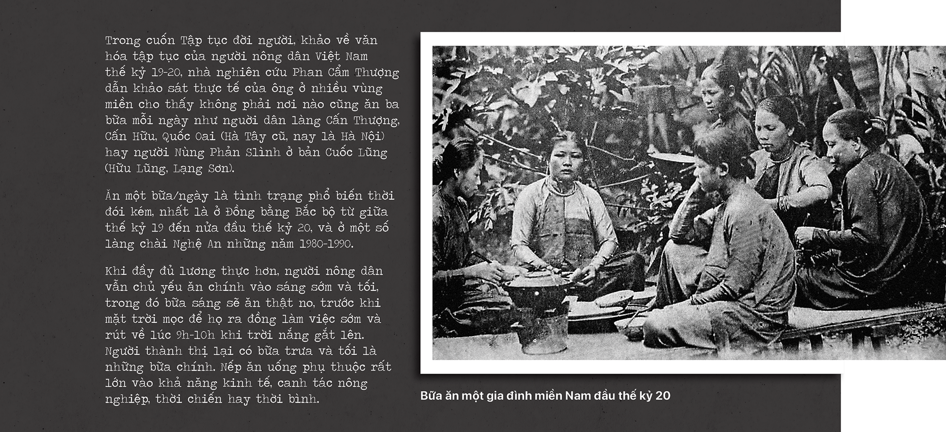 Nhưng ăn sáng, nếu có, chỉ là lót dạ qua loa, trưa thì chỉ nhà khá giả mới có thứ gì đó thừa lại từ hôm trước để ăn, phần đông dân chúng đến cuối chiều mới có một bữa đúng nghĩa, với nhà nghèo thì có khi đó là bữa ăn duy nhất trong ngày.