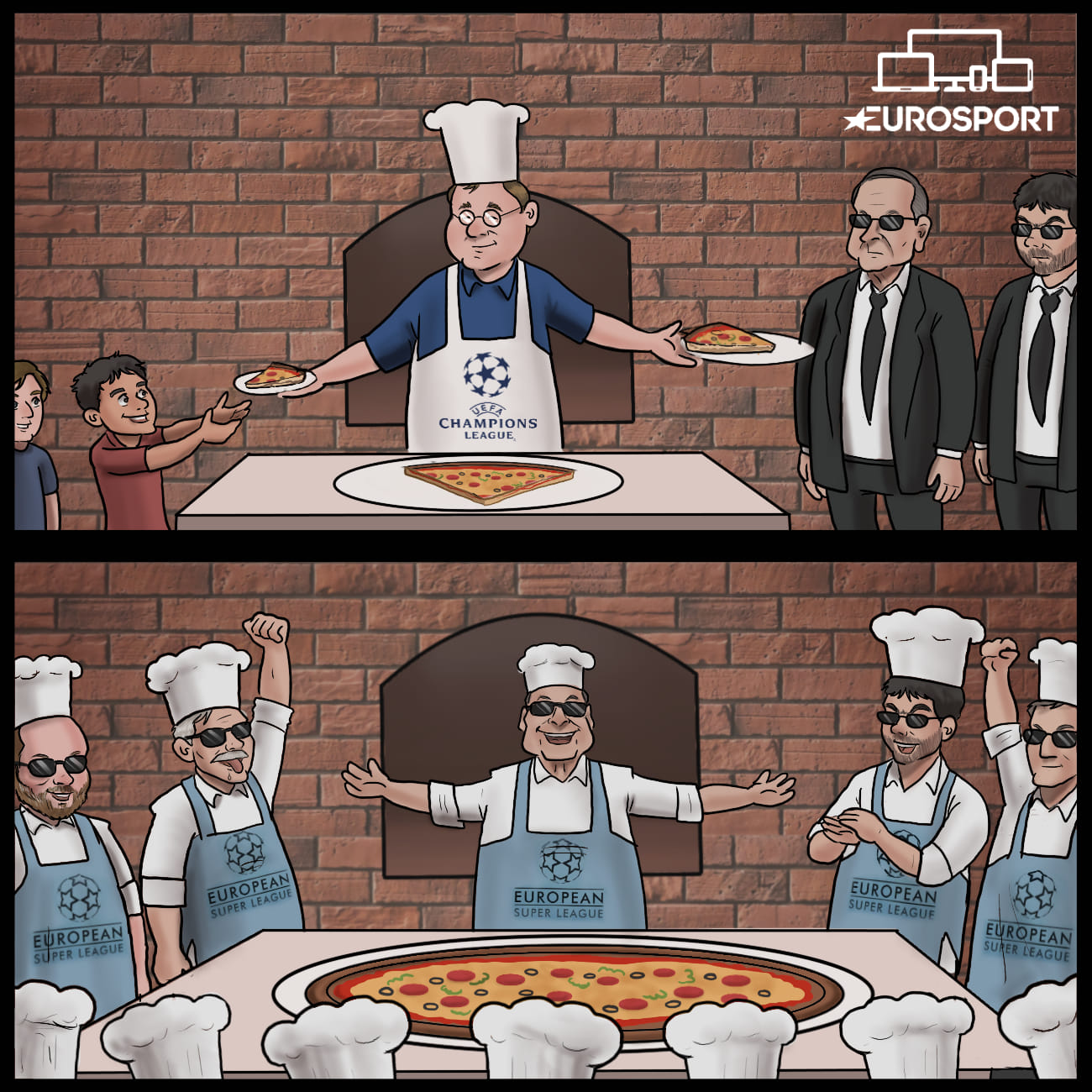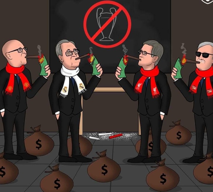 Chủ tịch Real, Perez là 'chủ xị' cho vụ lập ra European Super League. Ảnh: Zezo Cartoons.Và như người ta bảo “có tiếng thì có miếng”, chỉ cần Perez “alo” thì ngay lập tức Super League nhận được một nguồn tài trợ khổng lồ tầm 5 tỉ đô la từ ngân hàng J.P Morgan của Mỹ. Như vậy, tính sơ sơ, chỉ cần gật đầu tham gia, các CLB sẽ đút túi khoảng 250 triệu đô la, chưa kể đến những nguồn thu nhập khác như tiền quảng cáo, bản quyền truyền hình…