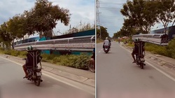 Thay vì chặt cây chuối thành 3 phần cho gọn, người đàn ông để nguyên cây buộc lên xe, chạy chắn ngang đường khiến những người đi sau không thể vượt qua.