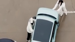 Tài xế oằn mình kéo ô tô vào chuồng