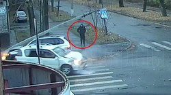 Một tài xế ở Trung Quốc đã thoát chết thần kỳ khi chiếc xe đầu kéo vào cua bất ngờ lật thùng container xuống đường, đè lên xe ba gác.