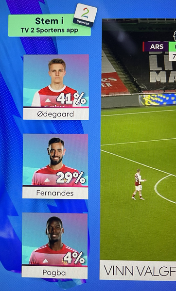 Khi trận đấu mới bước sang phút 75, các khán giả của kênh TV2 (Na Uy) đã bầu chọn Odegaard là cầu thủ xuất sắc nhất trận Arsenal vs MU. dù tiền vệ 22 tuổi... chưa vào sân. Tân binh Arsenal giành được 41% phiếu bầu, cao hơn hẳn người xếp thứ hai là Bruno Fernandes (29%).