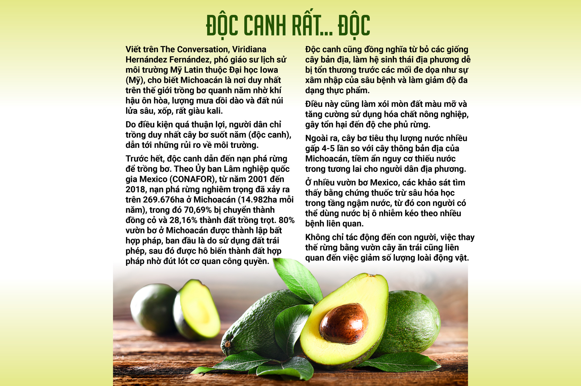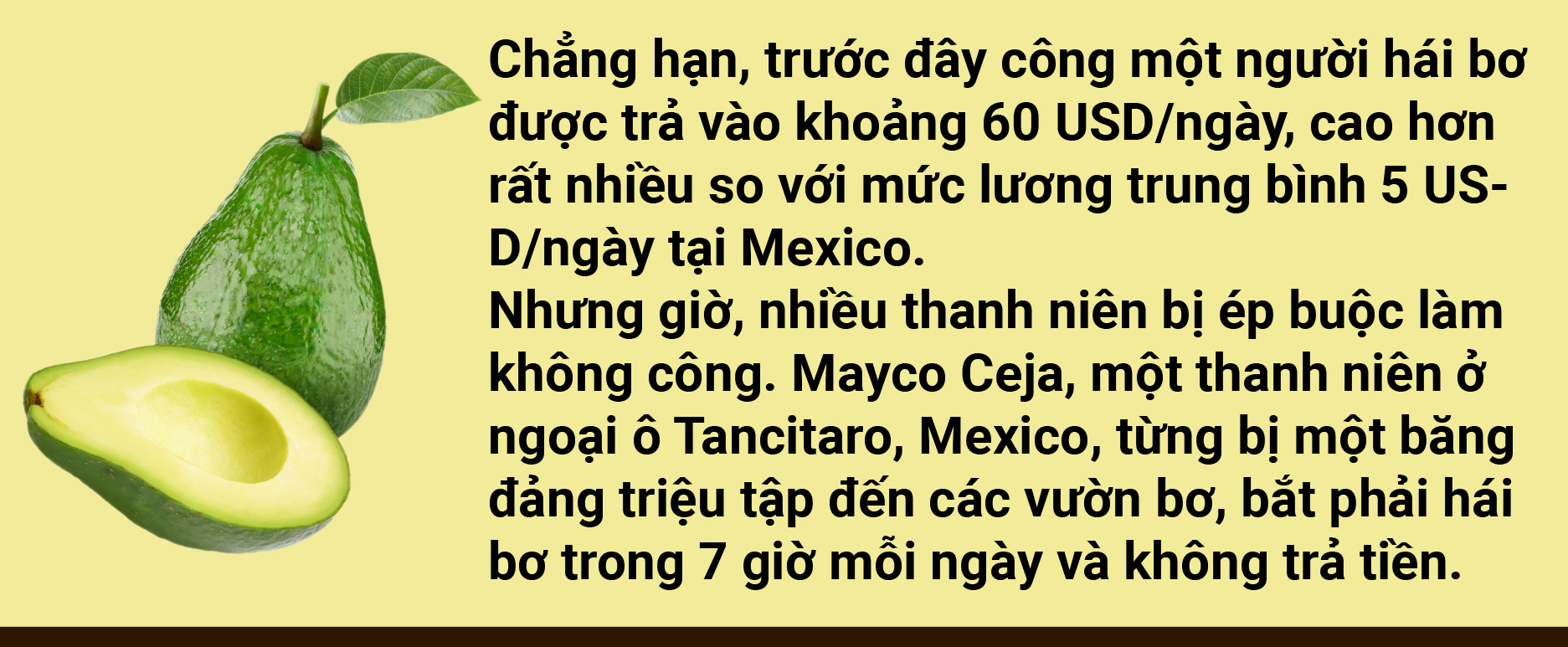 Nguyên nhân là Michoacán - thủ phủ bơ của Mexico, chiếm tới 90% sản lượng trong nước, từng ghi nhận hơn 10.000 vụ giết người, chỉ tính từ thời tổng thống Andres Manuel Lopez Obrador (bắt đầu từ tháng 12-2018), theo Forbes.