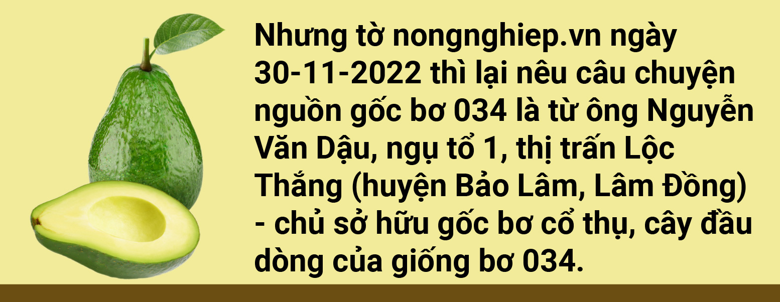 Tuy nhiên, tôi lại tìm thấy một công trình nghiên cứu khoa học mang tên "Nghiên cứu và phát triển giống bơ LĐ 034 phục vụ chương trình chuyển đổi cơ cấu giống cây trồng ở tỉnh Lâm Đồng và các tỉnh Tây Nguyên"của Trung tâm nghiên cứu và chuyển giao kỹ thuật cây công nghiệp và cây ăn quả tỉnh Lâm Đồng (nay là Trung tâm giống và vật tư nông nghiệp Lâm Đồng) công bố năm 2022 và đoạt giải khoa học của tỉnh này.