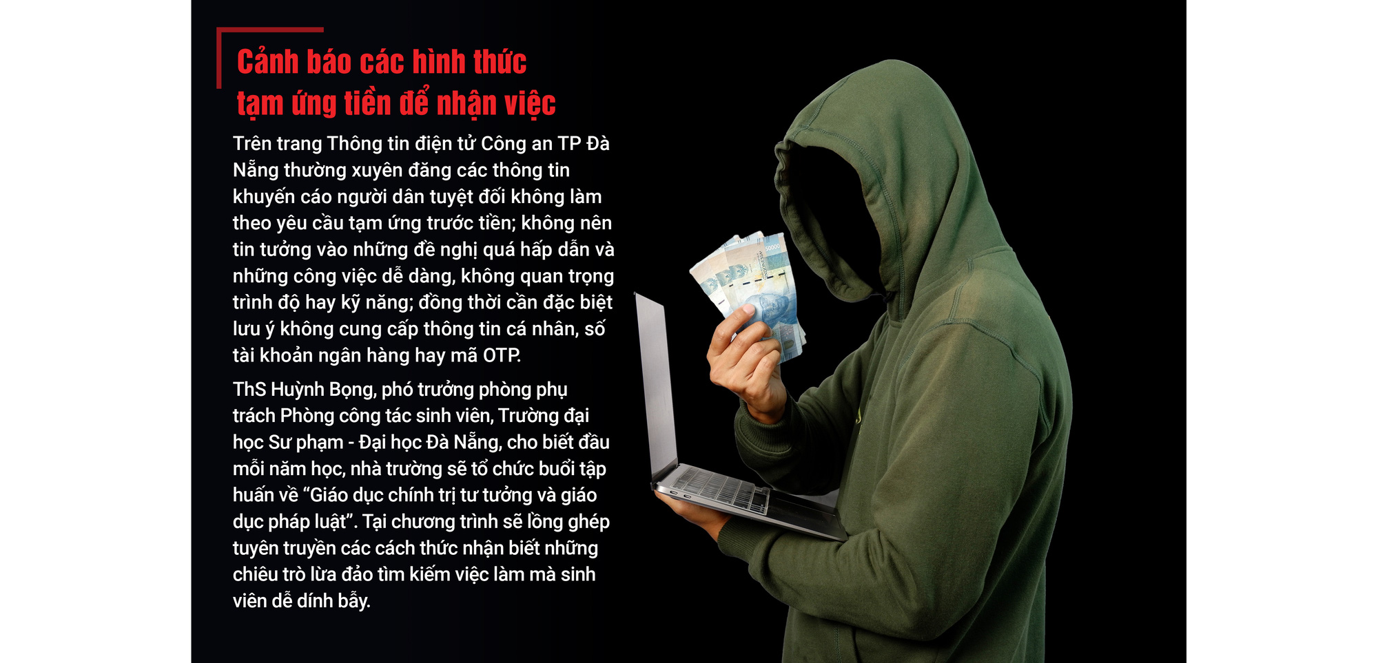 Theo vị này, có nhiều chiêu thức lừa đảo như việc làm sinh viên, việc làm thời vụ, việc làm online. Hình thức phổ biến là lừa sinh viên vào các mạng lưới bán hàng hưởng hoa hồng cao, làm thêm tại nhà hoặc làm thêm online song phải đóng phí, nộp tiền cọc. Có trường hợp sinh viên bán hàng online, làm nhiệm vụ thanh toán đơn hàng nhận hoa hồng sẽ bị chiếm đoạt tiền, bị đe dọa.