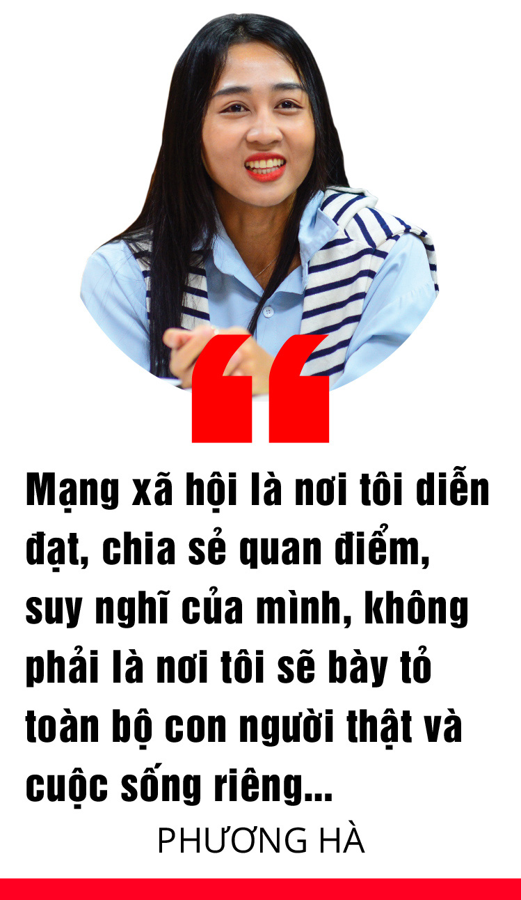 - Phương Hà: Với ý kiến "sống thật ở trên mạng, đưa nguyên con người mình lên mạng", câu trả lời của tôi là "Không". Trên mạng chỉ là nơi tôi thể hiện quan điểm, chia sẻ suy nghĩ của mình thôi, còn cuộc sống cá nhân, con người tôi phải là của tôi.