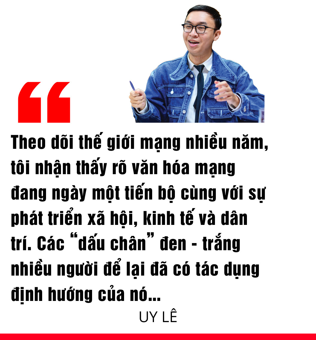 - Uy Lê: Tôi cho rằng mỗi cá nhân trên mạng xã hội, và kể cả mạng xã hội nữa, đều sẽ được rèn luyện kỹ năng học hỏi và tự điều chỉnh. Từ khi trở thành một nhân vật trên mạng xã hội, tôi đã phải học cách ứng xử với những yêu - ghét từ rất nhiều người vô hình.