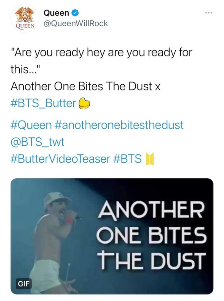 Thế nhưng, không để khán giả và fan hâm mộ tranh luận nhiều, mới đây trên trang Twitter chính thức của mình, nhóm Queen đã bất ngờ tweet về teaser Butter. Trên dòng caption còn ghi rõ: Another one bites the Dust x BTS Butter như ngầm xác nhận cho màn collab đỉnh cao này.
